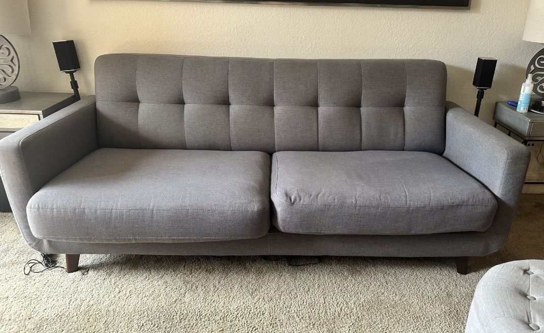 Gray Allie 82” Mid-Century Modern Sofa by Living Spaces Smooth Fabric, Tufted Backrest, Plush Cushion, Ample Comfort. Allie Model by Living Spaces. Excellent Shape. No Wear and Tear. Stain Free. No Rips. Original Condition. Clean. Pickup in 92139 or Delivery with Fee. Dimensions: Sofa Width (82in), Seat Height (18in), Depth (36in), Height (33in).