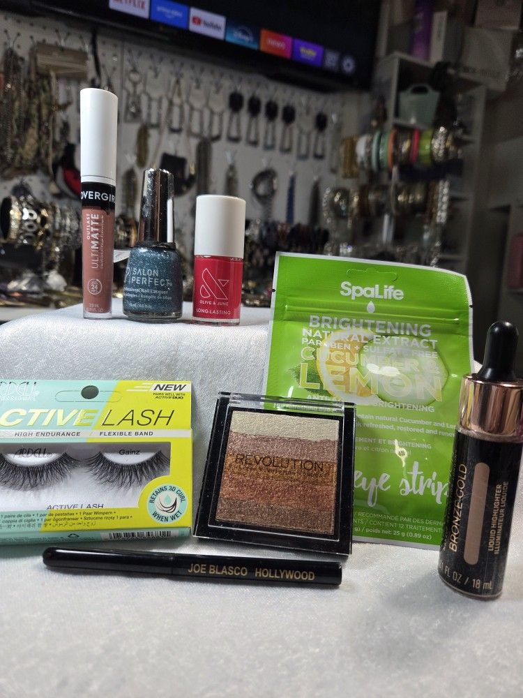 Cucumber lemon under eyes 12 treatment, covergirl outlast liquid lipstick in color very sancere, Joe Blasco retractable black eyeliner, Revolution bronzer and highlighter, Ardell eyelash set, Salon Perfect nail polish flash dance and Olive and June Hibiscus nail polish. Retail for all of this would be 60.00. $15.00 fir it all!