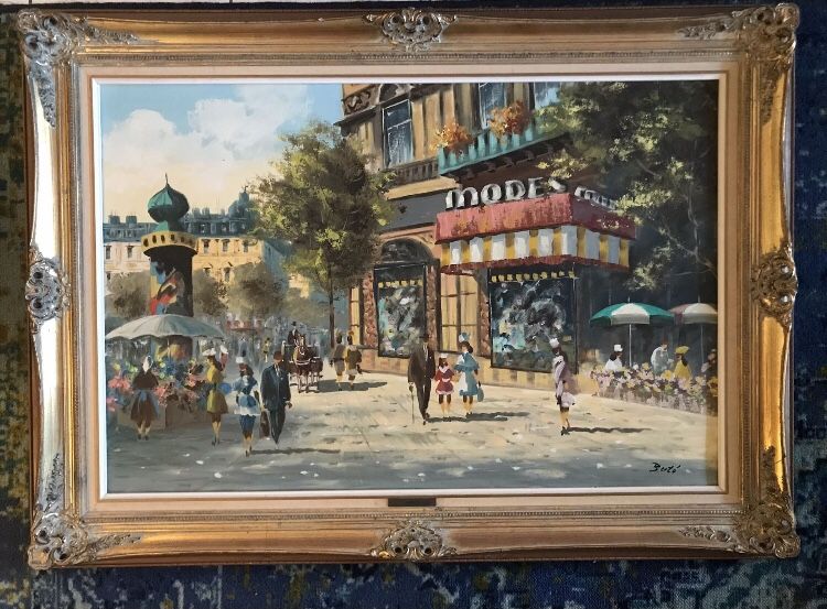 Dimensions Height: 32 Inches; Width: 44 Inches Description H. Berte was born in Cap D’Antibes, Riviera in 1912. After moving to tSouthern France, Berte used his French influences to paint captivating scenes of the Mediterranean coastline and street scenes. Berte then added skylines and dancers to his list of inspiration. Because of his unmatched skill and attention to detail, Berte’s paintings are in high demand around the world. This incredible find is a signed painting. Frame is in excellent shape and measures 44x32, the painting alone measures 36x24 $300 OBO