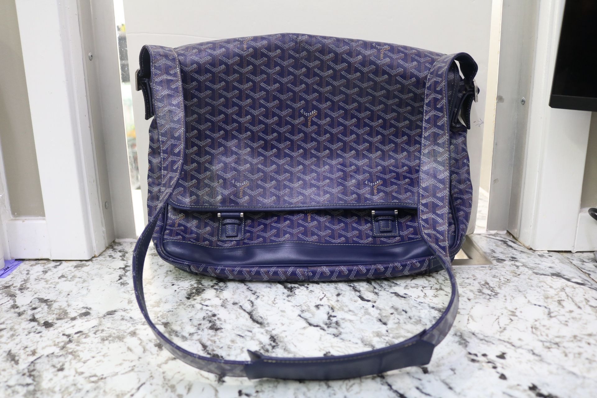 Up for sale, we have a Goyard Grand Bleu GM Blue Messenger Bag. The bag is in fair cosmetic condition with visible signs of use. The item comes with a LEGIT APP certificate of authenticity; no other accessories of any kind are included. The measurements of the handbag are 12 inches in Height, 15 inches in Length, and 3 inches in Width. As for markings, stains, or damage on the bag, some of them can be seen throughout the pictures attached to the ad. On the inside of the bag, there are stains, tears, and blemishes. On the exterior of the bag, there are stains, tears, and blemishes. Please view the pictures for the cosmetic details of the item you are purchasing. All the pictures seen in this listing are of the bag itself. If you have any questions or would like more photos, please get in contact with us. (contact info removed)0 (MNX) CG