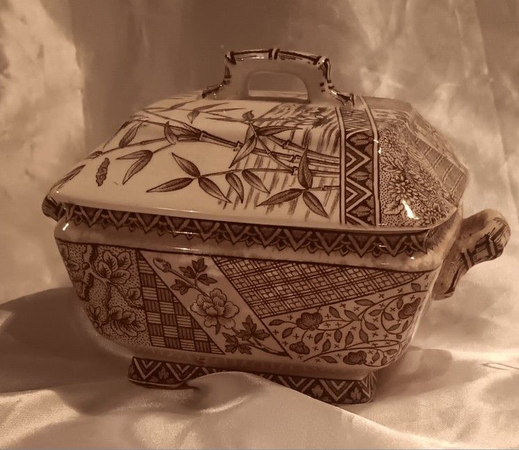 This is an antique W.H. Grindley & Co. brown transferware tureen in the "Burmah" pattern. • The tureen and lid feature an Aesthetic Movement design, including bamboo, birds, and geometric patterns. • It was manufactured in Tunstall, Staffordshire, England, around 1883. • The piece is made of ironstone, a type of durable earthenware. Price: $85 Condition: fair a single chip on the inner lip where lid sits