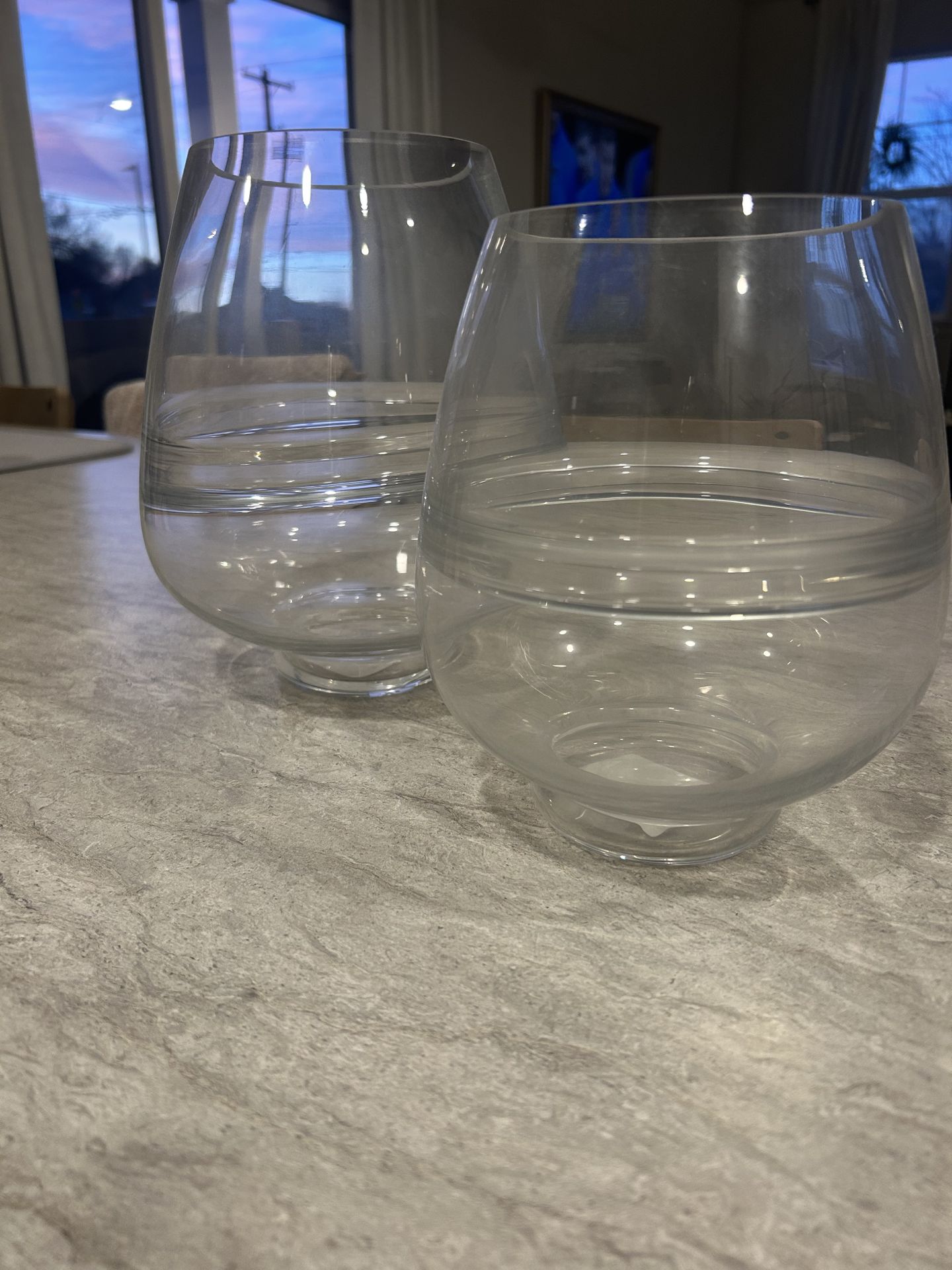 Set of 2 clear glass hurricane/candle holders. Height: Large is 10 in, Small is 8 in