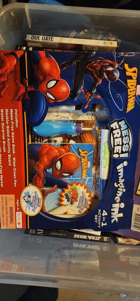 Includes mess-free game book, wipe-clean pen, dry erase board, and magic ink marker. Spiderman Imagine Ink 4-in-1 Activity Box Set, Spiderman 4-in-1 brand new