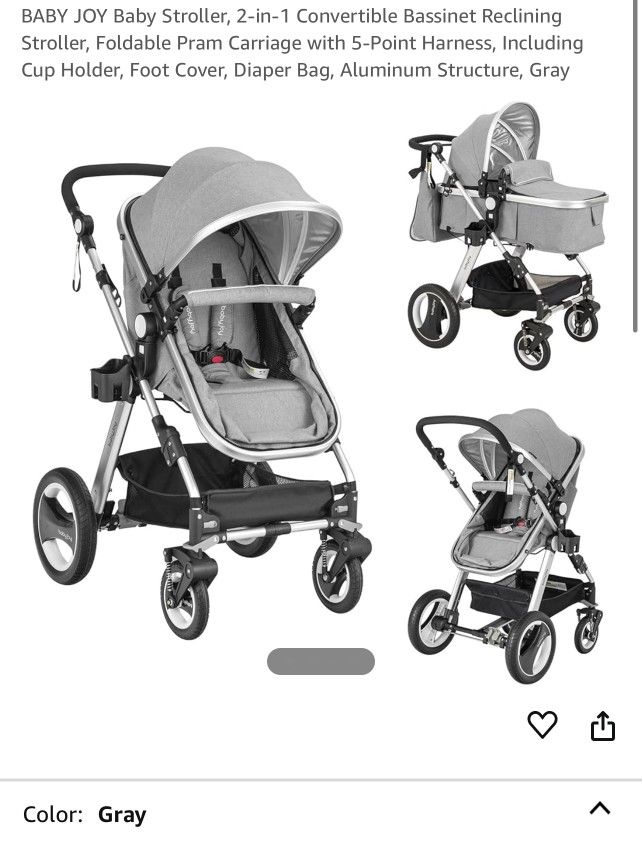 BABY JOY Baby Stroller, 2-in-1 Convertible Bassinet Reclining Stroller, Foldable Pram Carriage with 5-Point Harness, Including Cup Holder, Foot Cover, Diaper Bag, Aluminum Structure, Gray