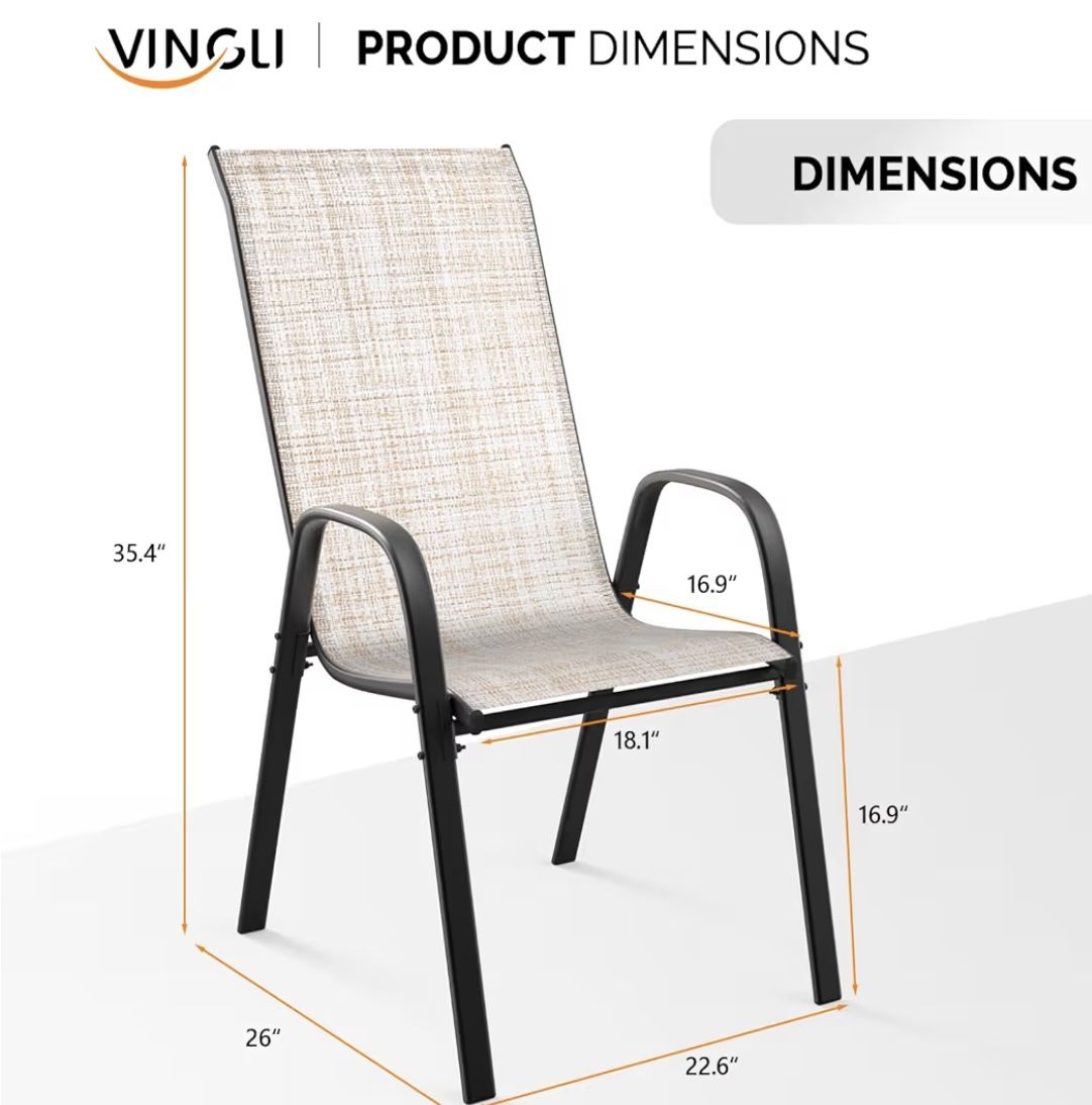 Brand new Vingli Set of 2 Product Dimensions 26"D x 22.6"W x 35.4"H Space-Saving Design: These stackable patio chairs are easy to store, perfect for smaller spaces like your backyard or yard Sturdy & Durable: Built with a rust-resistant coating, durable fabric, and a strong frame, these chairs are made for long-lasting outdoor use in any weather Comfortable & Breathable: The breathable fabric ensures a comfortable seating experience, ideal for year-round use, from warm spring to cool fall Non-Slip: Equipped with non-slip rubber foot pads to prevent floor scratches, reduce noise, and ensure stability Easy Assembly Pick up West Anaheim Payment method Zelle or cash