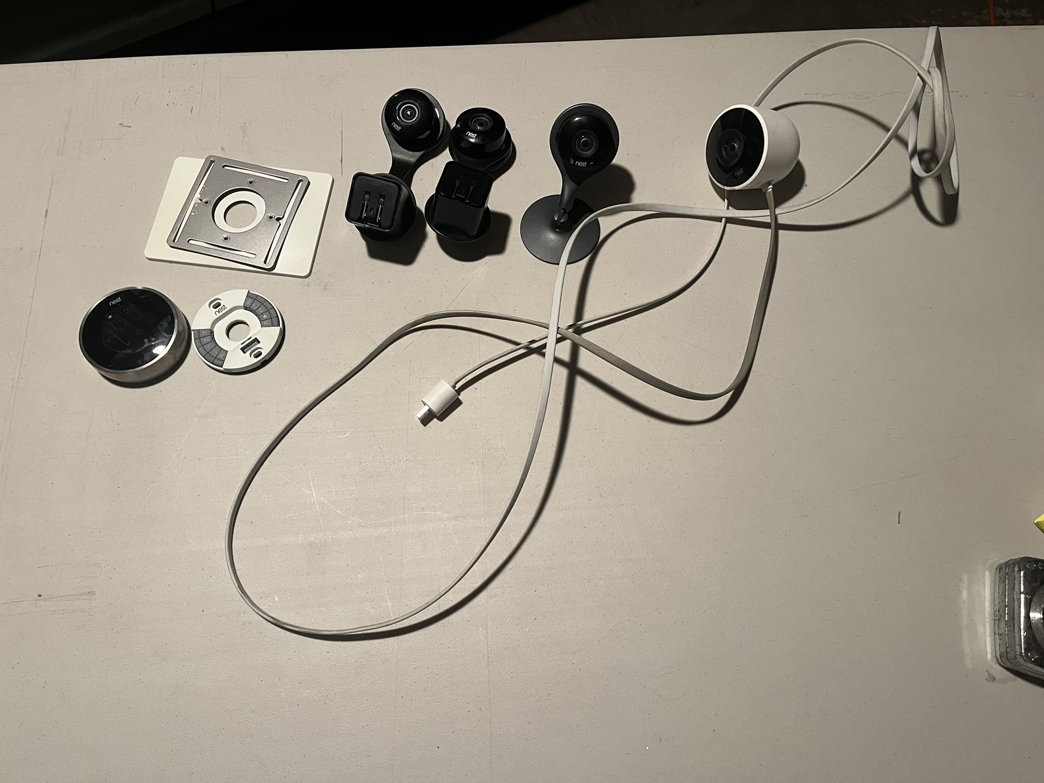 Nest -learning thermostat w/mounting plate: $125 - indoor /outdoor wired camera, white, usb power (no plug or base, w/ outdoor mount:$60 -indoor camera w stand, black (no cord) $50 -indoor camera with wall plug adapter black (with usb c cord)$ 45 -Indoor camera with wall plug adapter, black (missing usb c cord):$40