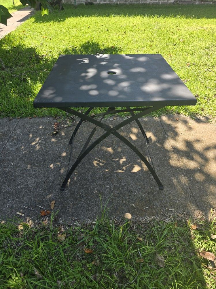 Black folding steel table. Umbrella holder integrated into design. (No Umbrella with Table) Heavy and Stable. Top surface is 2 ft 3 inches square. Table surface is 2 ft 4 inches from ground. $100