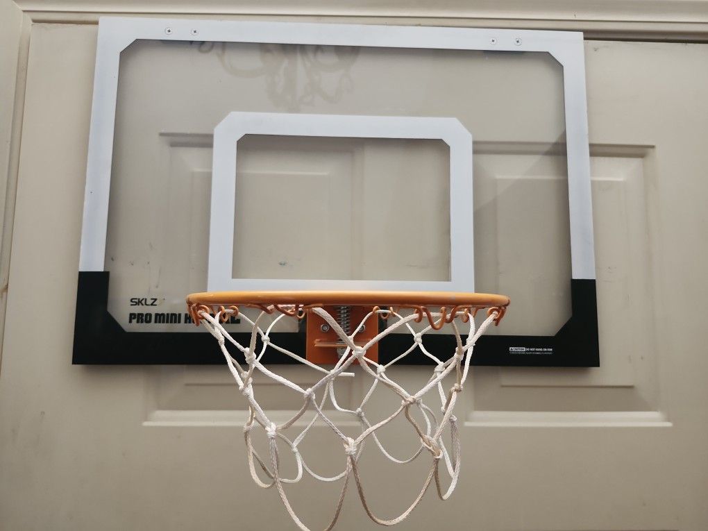 Hang on door Mini Basketball Hoop. Used, but in perfect working condition. Hangs well on door and padding on back of backboard is complete and in good condition. The rim is slightly faded to give it that real outdoor playground look!!! Must be picked up. $10 delivery fee if you want it dropped off.