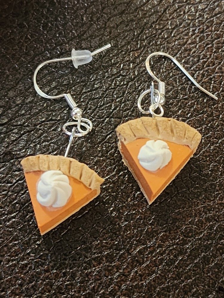 Handmade pumpkin pie dangle earings or necklacecharm. Whole pie available as well. Made from polymer clay and sterling silver hypoallergenic hooks.