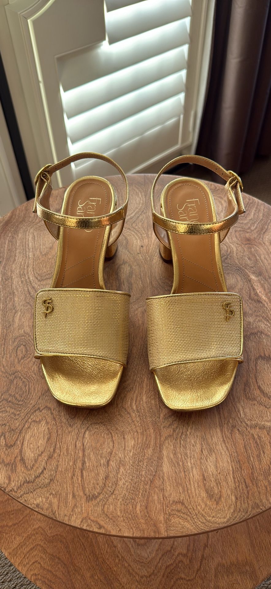 Gold open toe sandals with chunky heel Buckle closure Size 7.5 Medium Color: Gold Brand: Franco Sarto Heel: 3” In great condition