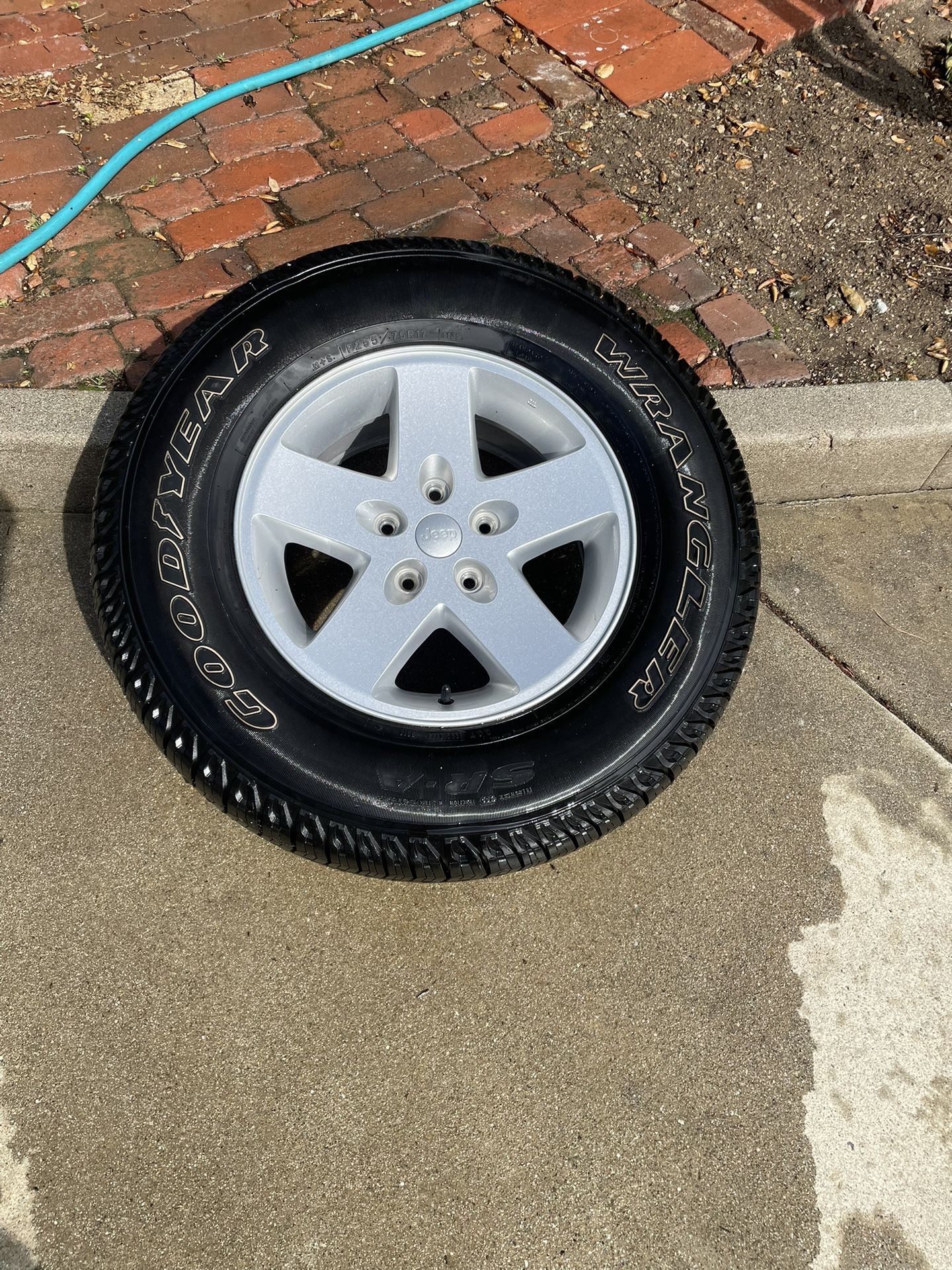 Original from a 2016 Jeep wrangler unlimited sport. 5x127 lug pattern 5 rims 255/75/R17 Goodyear Tires