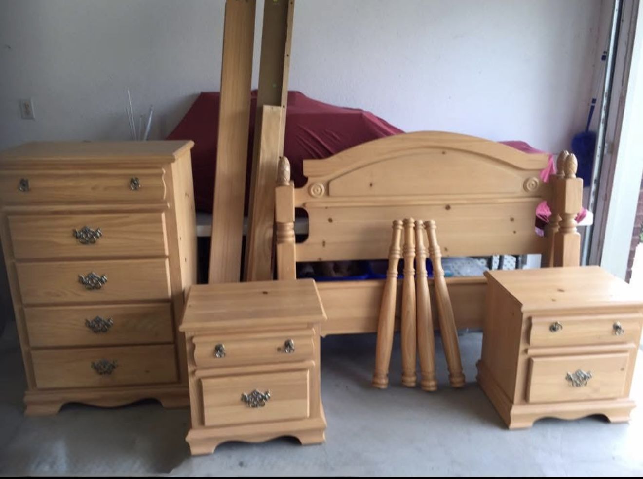 Beautiful full-size bedroom set made of solid pine wood, very sturdy, great quality, and in great condition. Purchased from IKEA From a smoke-free home. Set includes: • Headboard • Footboard • Side rails • Canopy posts • 2 nightstands • Chest of drawers Classic wood finish, solid construction, and well maintained, perfect for a child’s room, guest room, or everyday use.