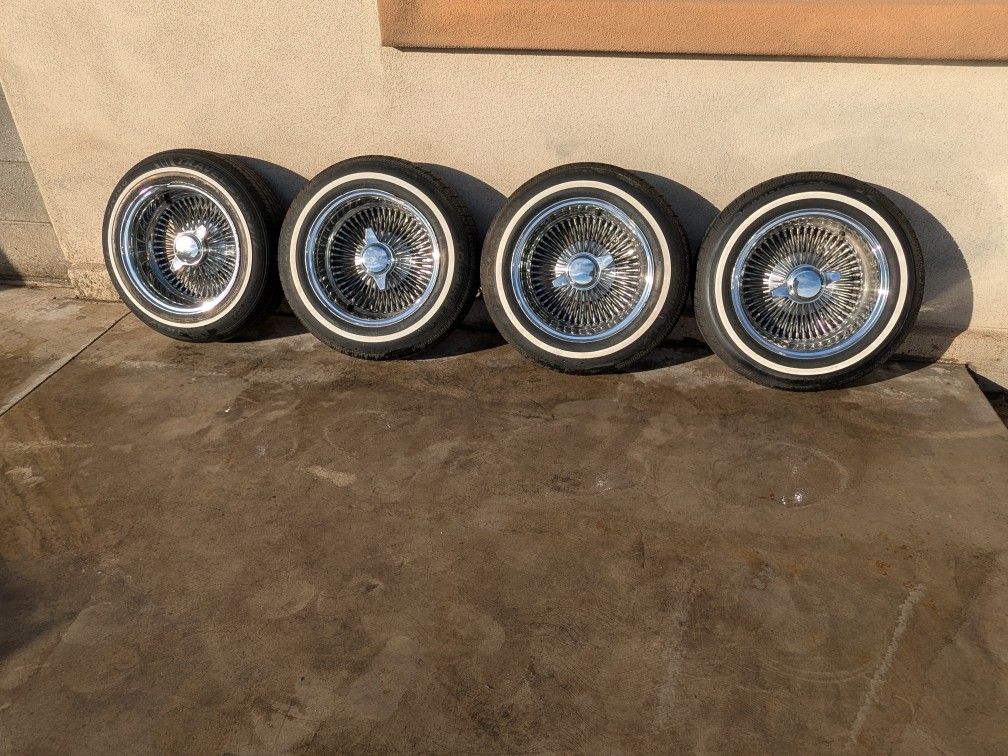 $800.. used set not perfect 100 spoke 14x7 has knock-offs and adapters good tires all hold air.. Phoenix AZ 16th st and Buckeye Classic OG Old-School White Walls Lowrider Rims Tires 13x7 Dayton USA China's Zenith Luxor Roadster Spinner Original