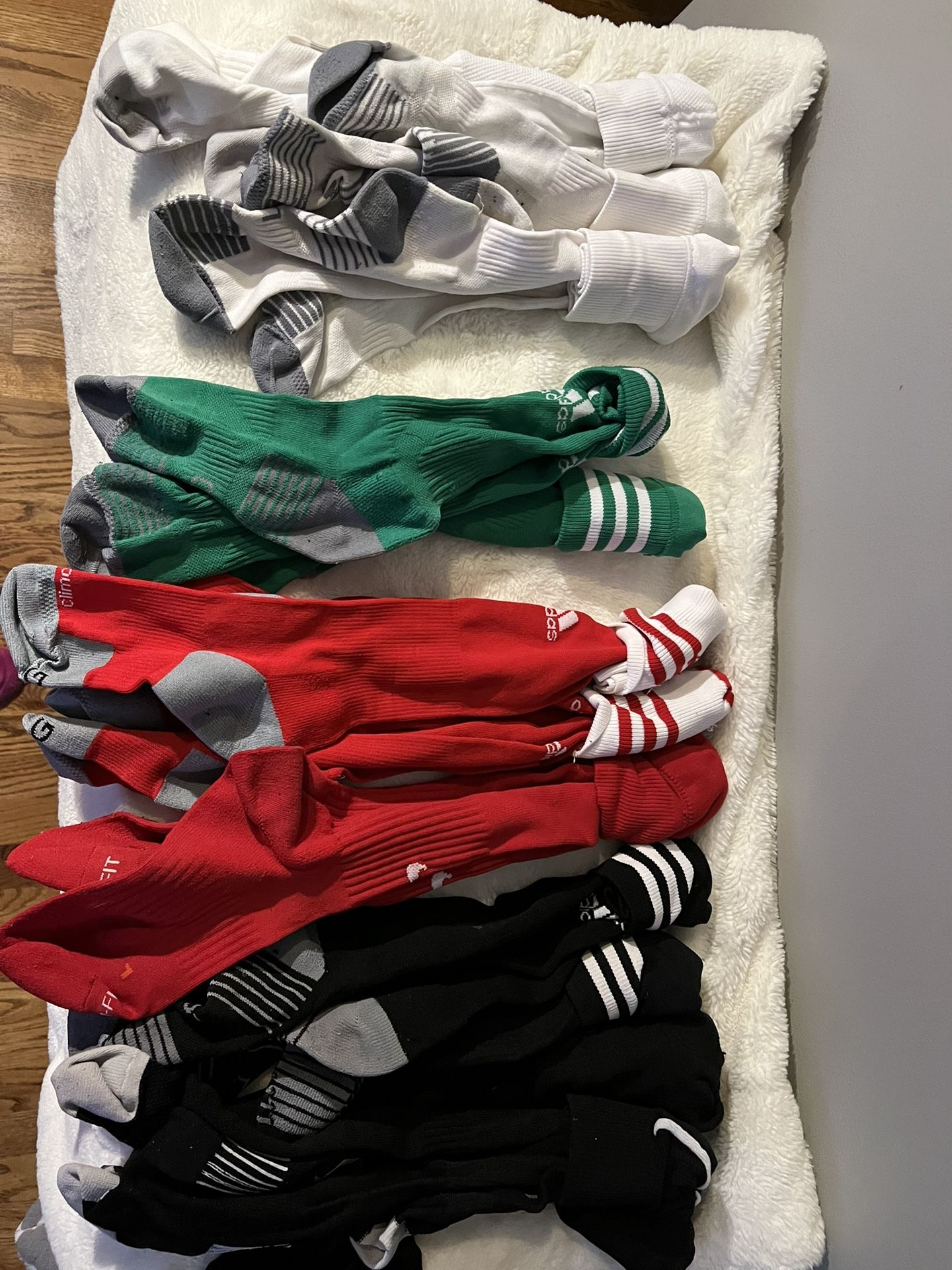 Soccer socks, medium size, 3 white pairs, 4 green , 3 red, 4 black. ( adidas and Nike brand).