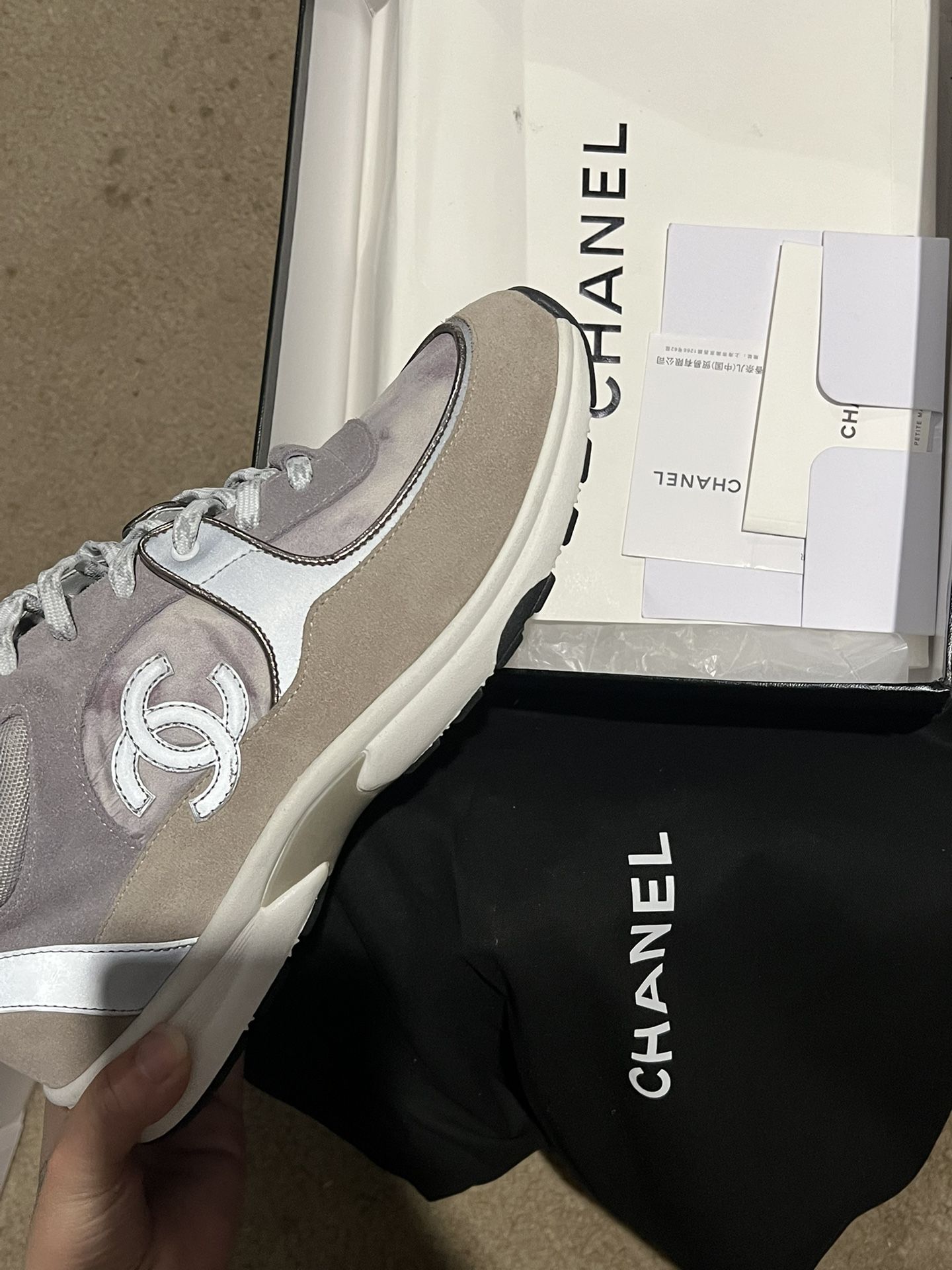 Athletic woman’s shoes size 46 very nice and comfortable suede shoes. They go for $hundreds brand new I’m asking for hell of a deal for the quality no flaws at all. Comes with Chanel bag and everything.