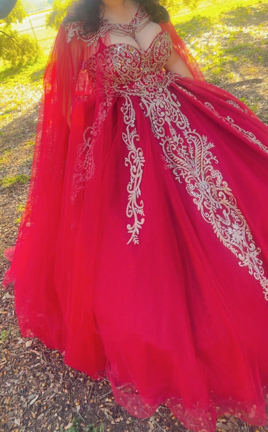 Red and the size is a large and has a petticoat and a shoulder cover