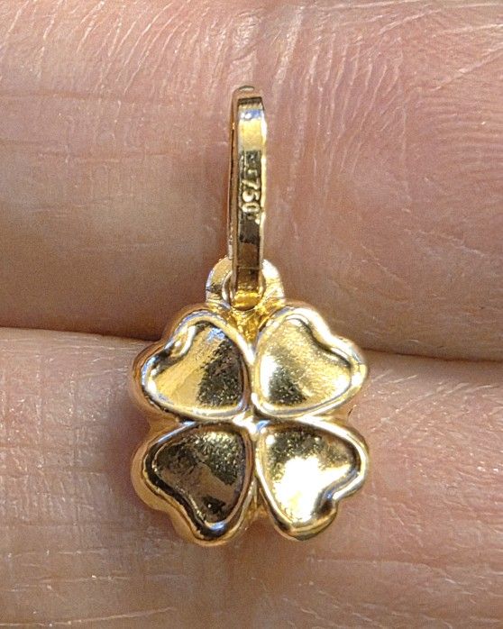 Brand new and never been used, clover pendant, 18k, pawnable. 9mm in size. 1.02g