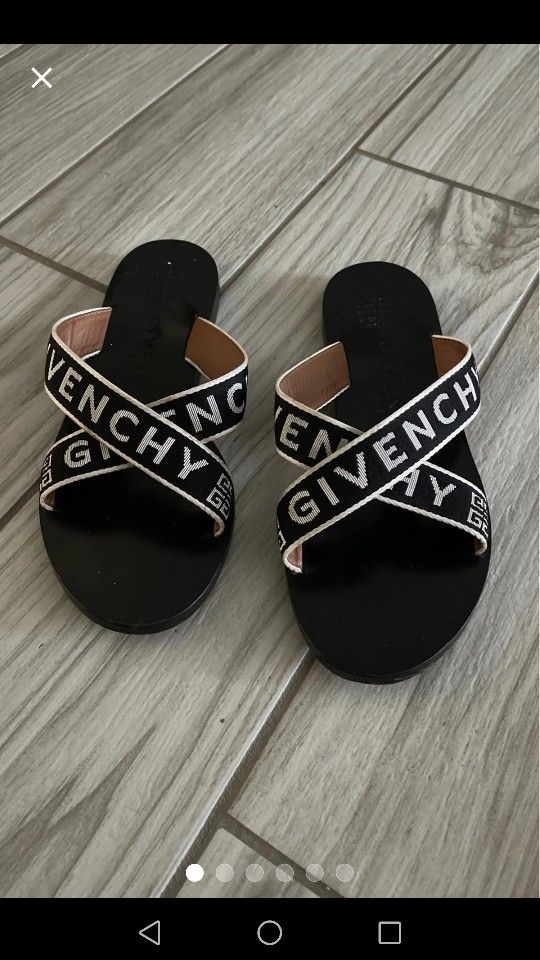100% Authentic- retails $495 Black & White Logo Cross Givenchy Sandals Style#: 202278F124061 Black & White Size 7 Buffed leather slip-on sandals in black. Open round toe. Criss-crossing straps. Upper: leather, textile. Sole: leather. Made in Italy.