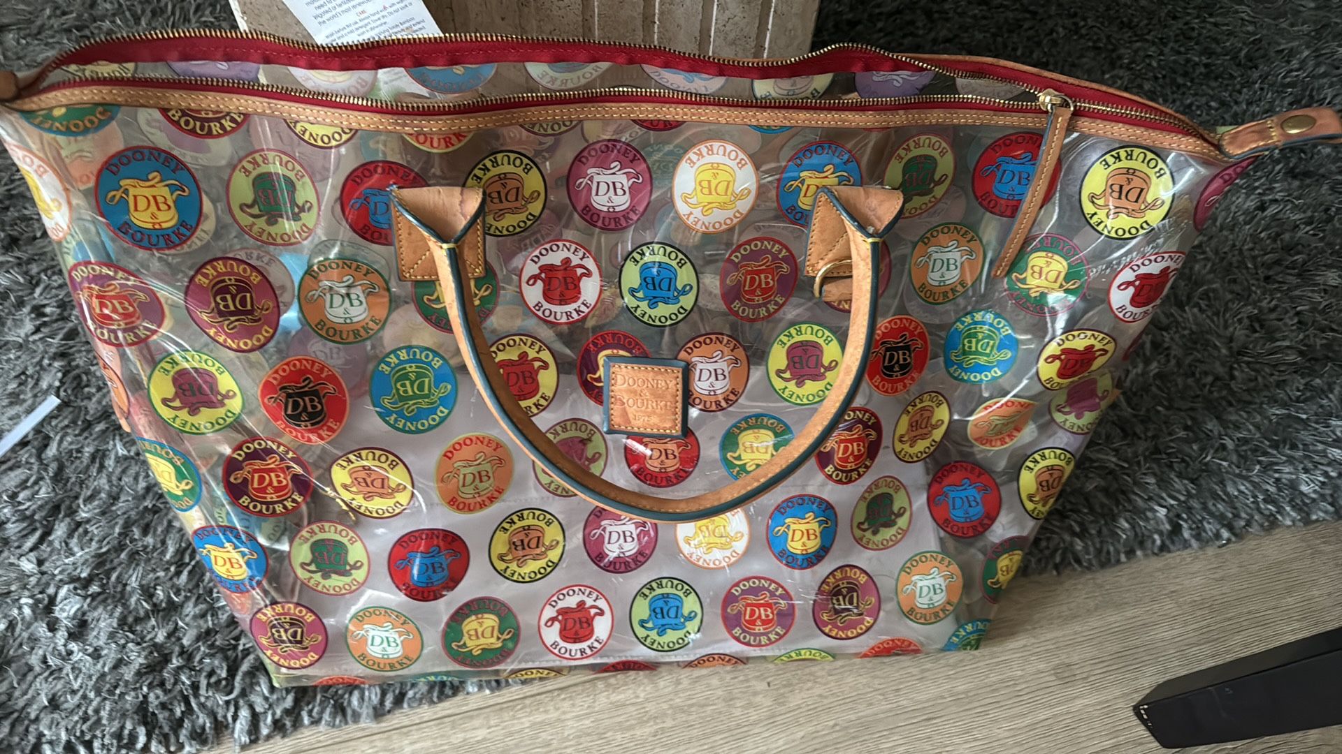 1975 vintage Dooney & Bourke W/ leather straps Clear W/ db styled throughout Very large bag (travel/tote ..etc) 120
