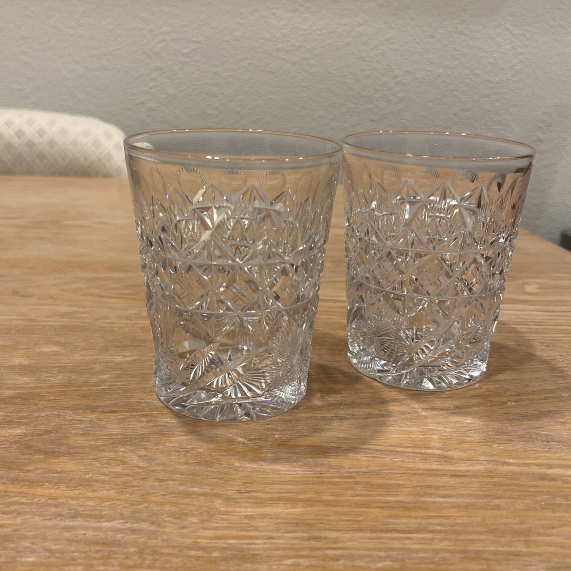 Gorgeous cut crystal glasses with intricate design Sold as a pair One has an imperfection near the bottom as pictured but doesn’t affect use and not very noticeable