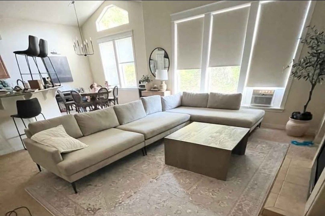 Can deliver within reasonable distance. Stunning West Elm sectional! 3 piece in the Clay, Deluxe Velvet. This rich cotton-blend velvet has a soft, lush handfeel.Hand-built frames with hand-finished upholstery. Cast metal legs. Solid eucalyptus and engineered hardwood frame with reinforced joinery. Tied-spring cushion support. Seat cushions have fiber-wrapped, high-resiliency polyurethane foam cores. Seat firmness: Medium. On a scale from 1 to 5 (5 being firmest), it's a 4. Back cushions are fiber filled. Loose cushions with zip-off covers; seat cushions are not reversible. Sectional pieces connect via bracket attachments (included). Removable legs. length 166" depth 47" chase 101"