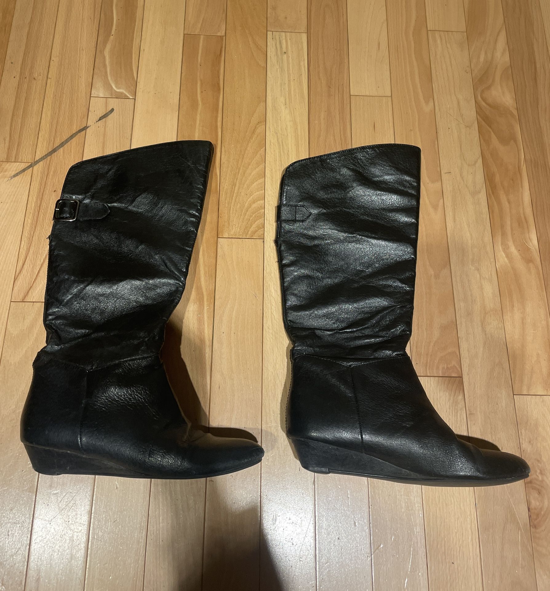 Women’s black leather slouch boots with low wedge heel and side buckle detail. Leather uppers with a soft, broken-in feel. Originally retail around $60–$90 when new. Well worn with visible creasing and scuffs consistent with age and use. No rips, tears, or structural issues. Soles and heels intact. Comfortable, wearable boots — priced to move. $5 cash. Sold as-is. See photos for condition.