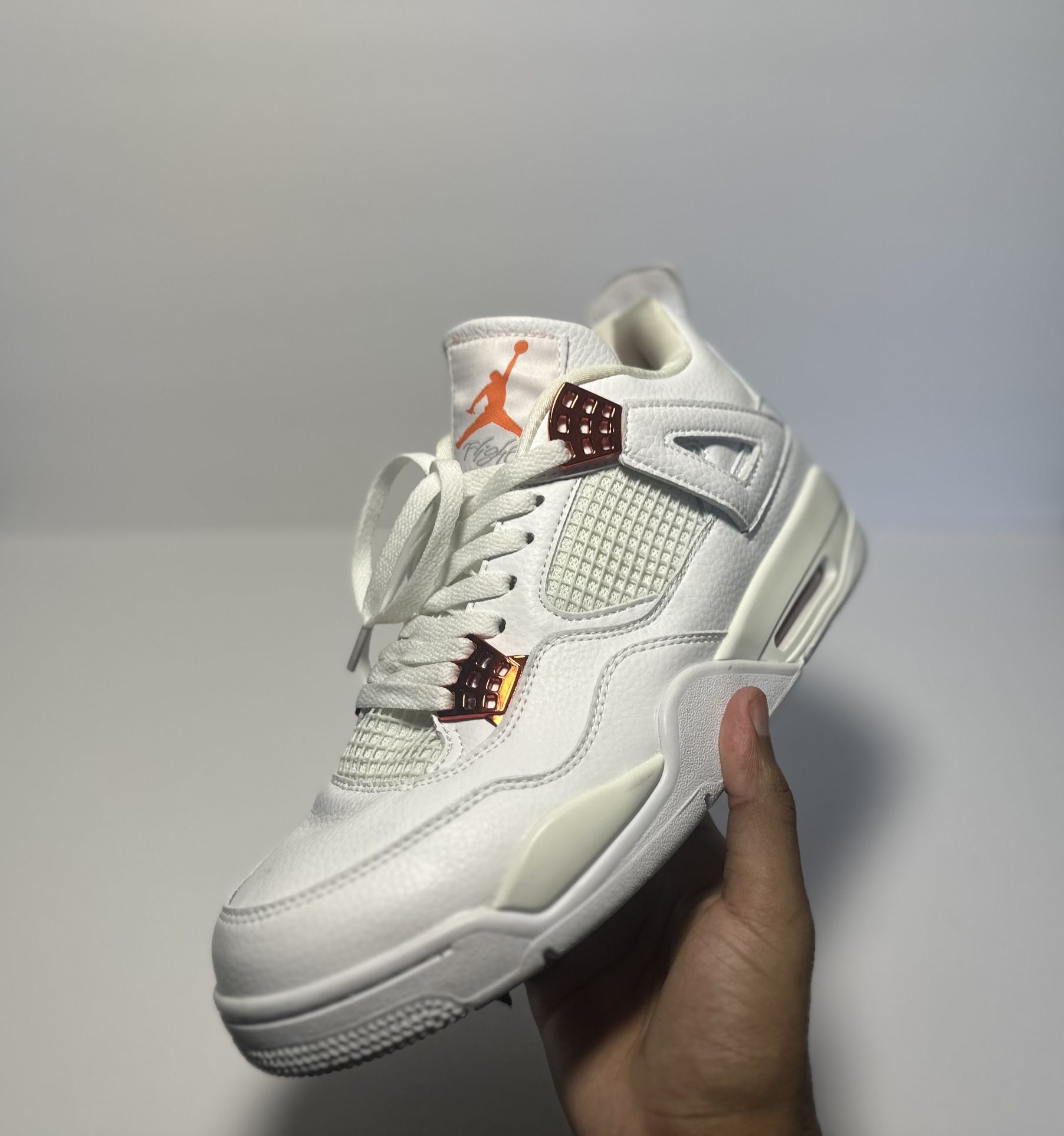 The Metallic Orange Jordan 4s combine a crisp white leather upper with striking metallic orange accents, creating a bold and modern look. With a matching midsole and the iconic Air unit, these sneakers offer style and comfort, perfect for making a standout statement.
