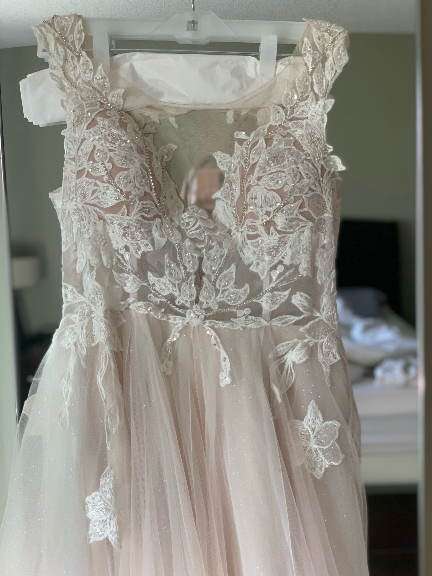 Get it near new for half off! GALINA SIGNATURE Illusion Plunge Lace Appliqued Wedding Dress. Ivory/cashmere Purchased from David’s Bridal, worn for 3 hours. Cost over $2,000. Size 12. Modified sleeves.