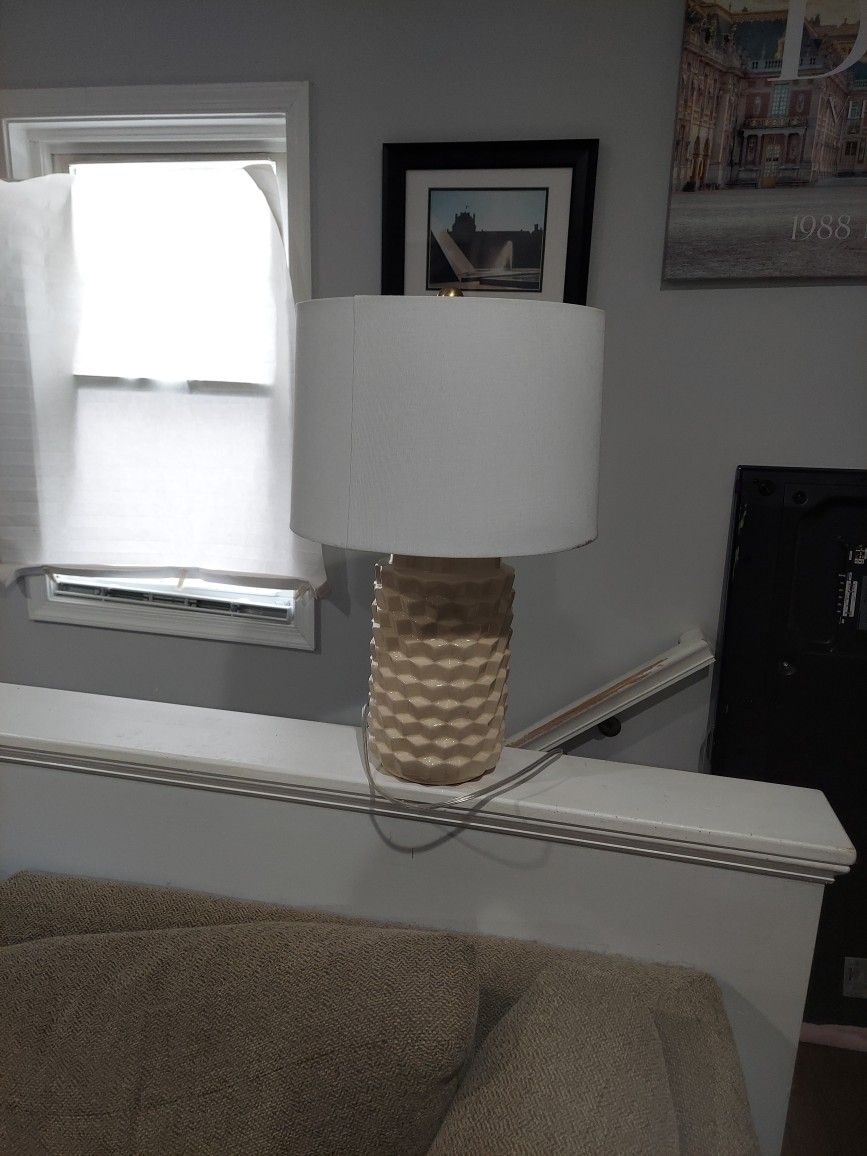 Safavieh ceramic table lamp 23.5" tall, lamp shade diameter at the top is 14" In like new condition.