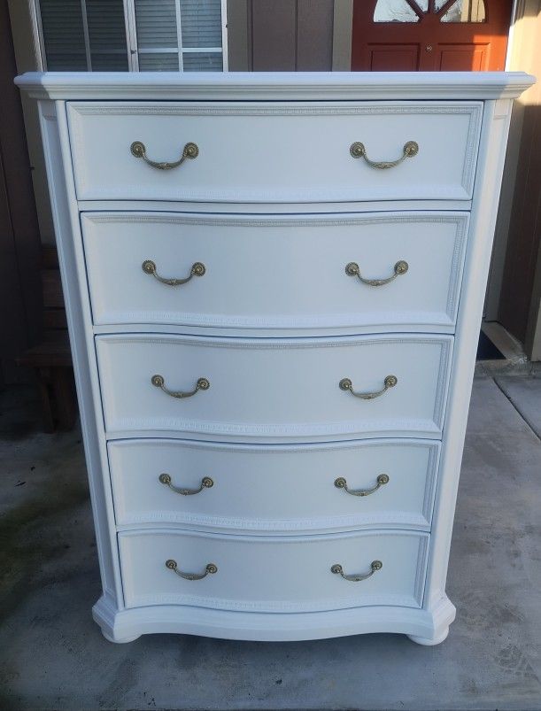 H60" W42" D21" NOTE DIMENSIONS. IT'S VERY TALL. Refurbished. Excellent condition 5-drawer dresser. No damage/issues. Drawers open/close smoothly. Large with a ton of storage space. Dovetail joints. First come first served. No holds.