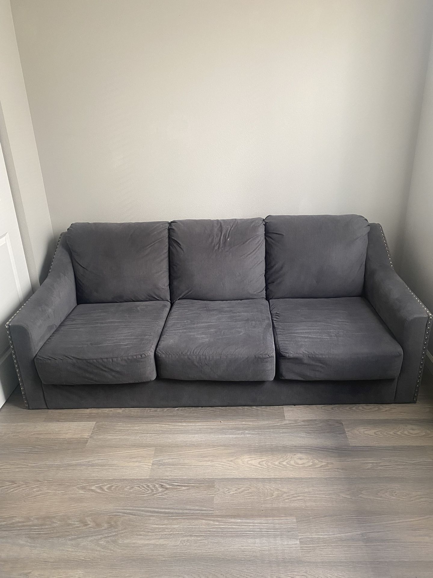Light blue grey 3 seater couch with attachable legs included.