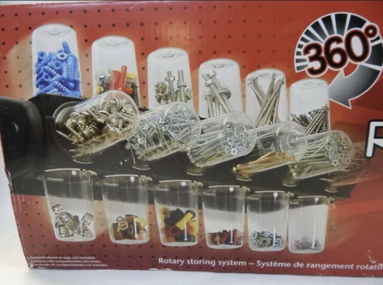 Used - missing one cup. No box Great use for screws, bolts, etc Spins 360 to access everything easily