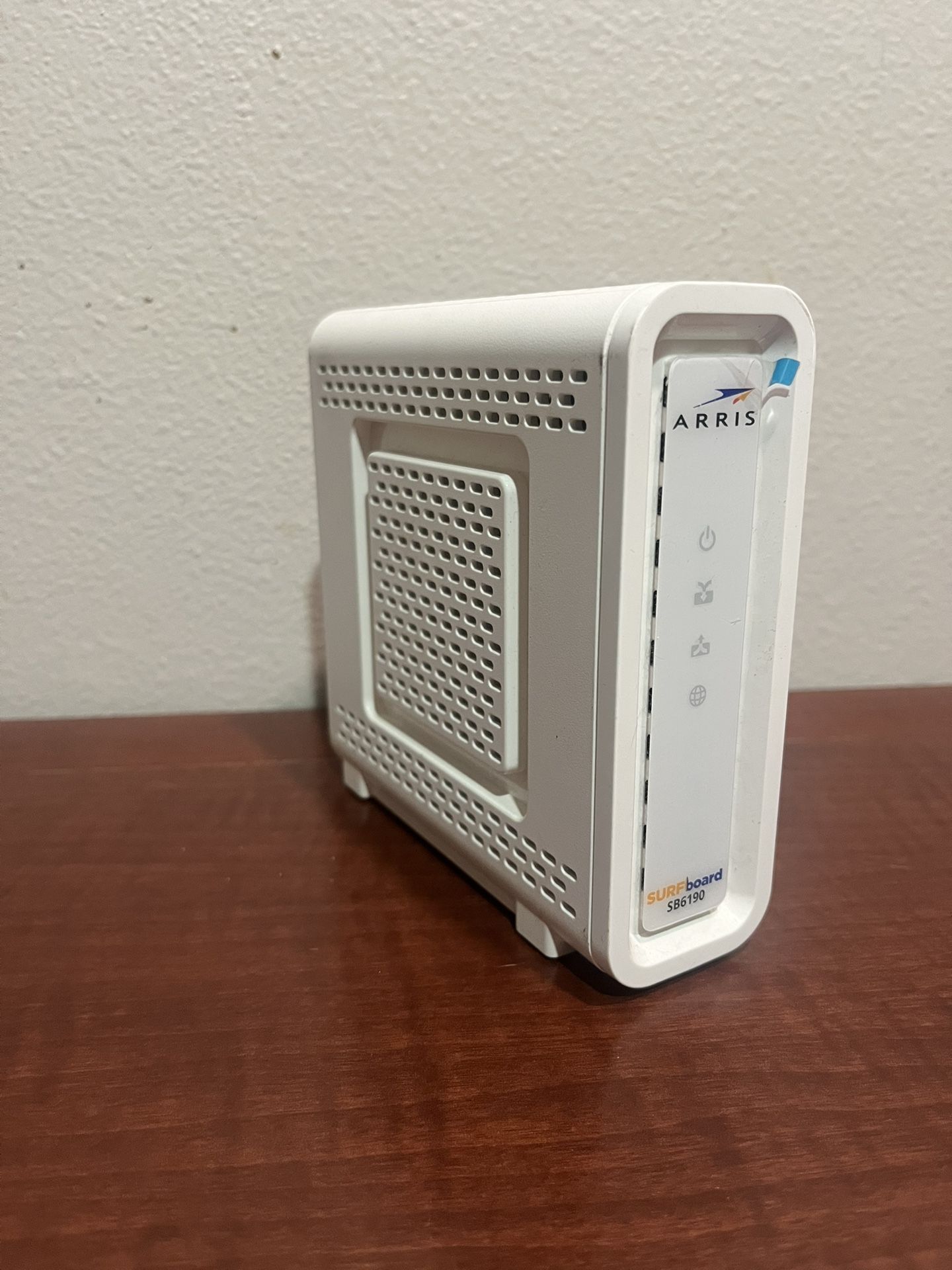 High-Speed Cable Modem - DOCSIS 3.0 with 32x8 channel bonding. Compatible with Spectrum, Comcast, Xfinity, Cox and other broadband providers. Rather than pay $5 to $10 per month in rental fees, you can buy this outright for $10 and it pays for itself in a month or two! Details: The Arris Surfboard SB6190 is a popular DOCSIS 3.0 cable modem, known for its 32x8 channel bonding, offering speeds up to 800 Mbps (or even 1.4 Gbps) on compatible plans from providers like Xfinity, Cox, and Spectrum, and featuring a gigabit Ethernet port for connecting a router or computer.