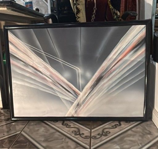 Cantrell's oil painting on canvas features an abstract design with dynamic geometric lines. "26x38"