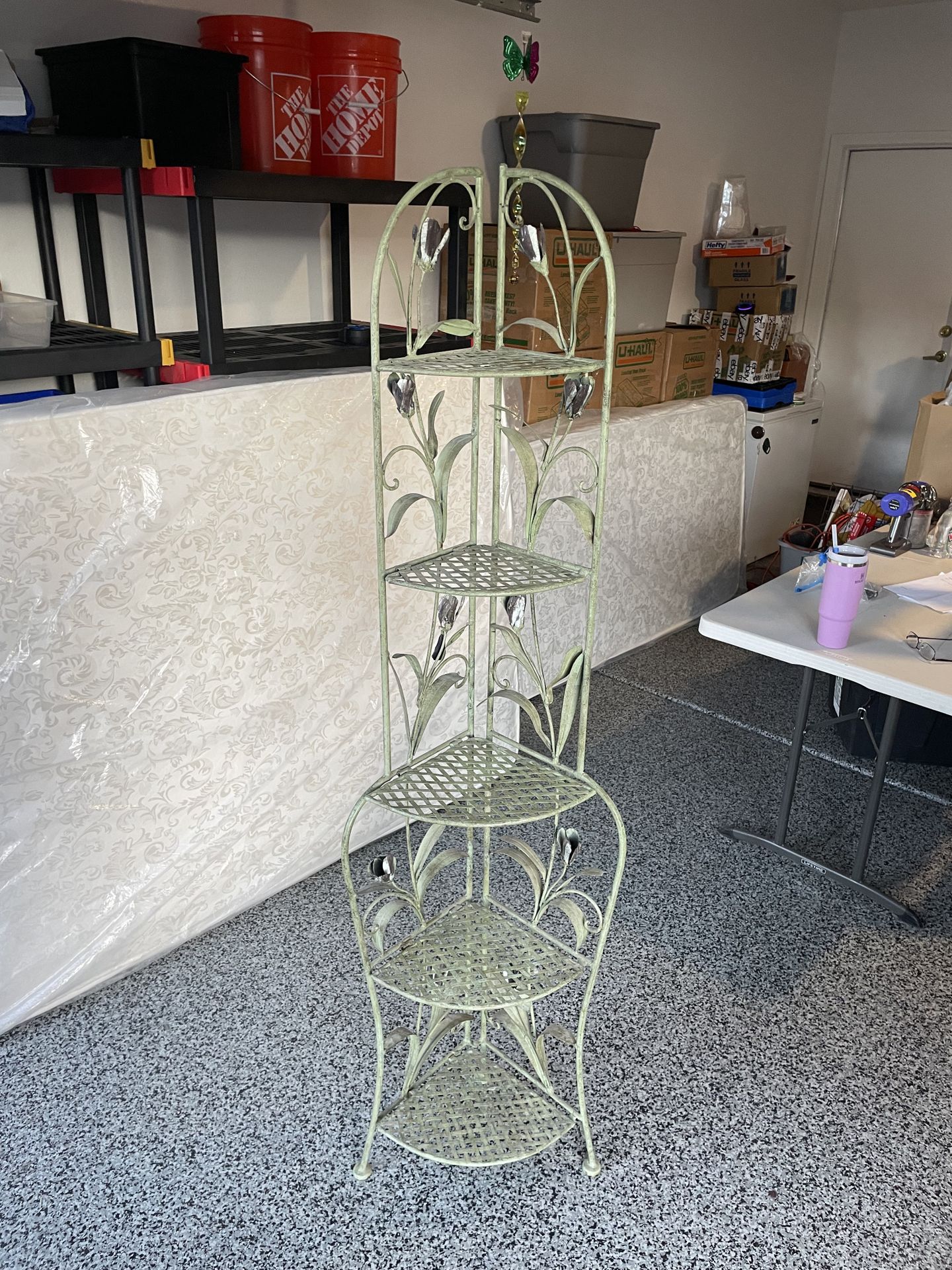 This vintage style wrought iron corner plant stand features a five tier design with decorative floral and leaf motives. Its tall, slim profile is specifically designed to fit into corners, making it a space-saving option for both indoor and outdoor display. Product detail, details and identification Floral adorned Style French antique style folding corner shelf with a vertigo greenish patina finish Material crafted from right iron for durability Functionality collapsible foldable for easier transport and storage Dimensions five tier stand 70 inches tall Please leave a message and I will send my cell phone for a text or call. We are located in Las Vegas, NV 89129.