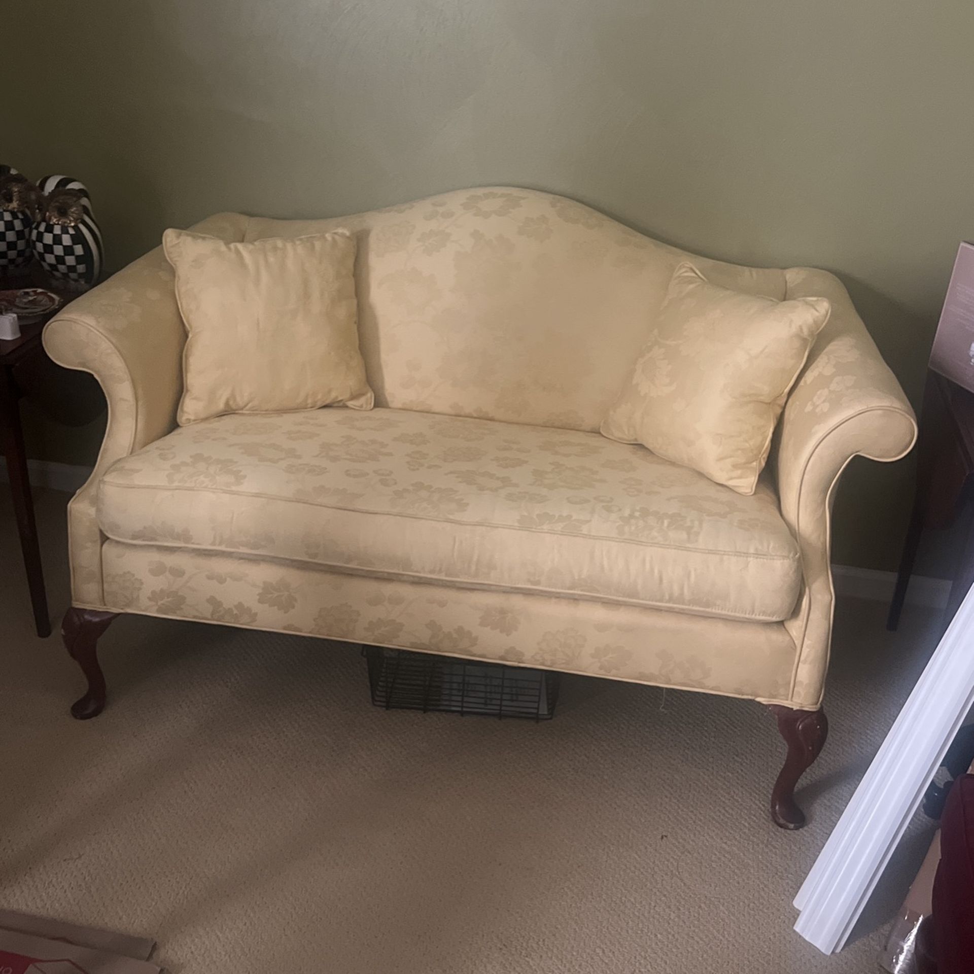 Queen Ann extra wide 66” Satee. Silk demasc fabric yellow. Queen ann legs. Like new condition. Rarely sat on. Excellent framework and quality. Also have 2 chairs for sale as well( in pics) the chairs are firm at $100. Call (contact info removed) if interested.