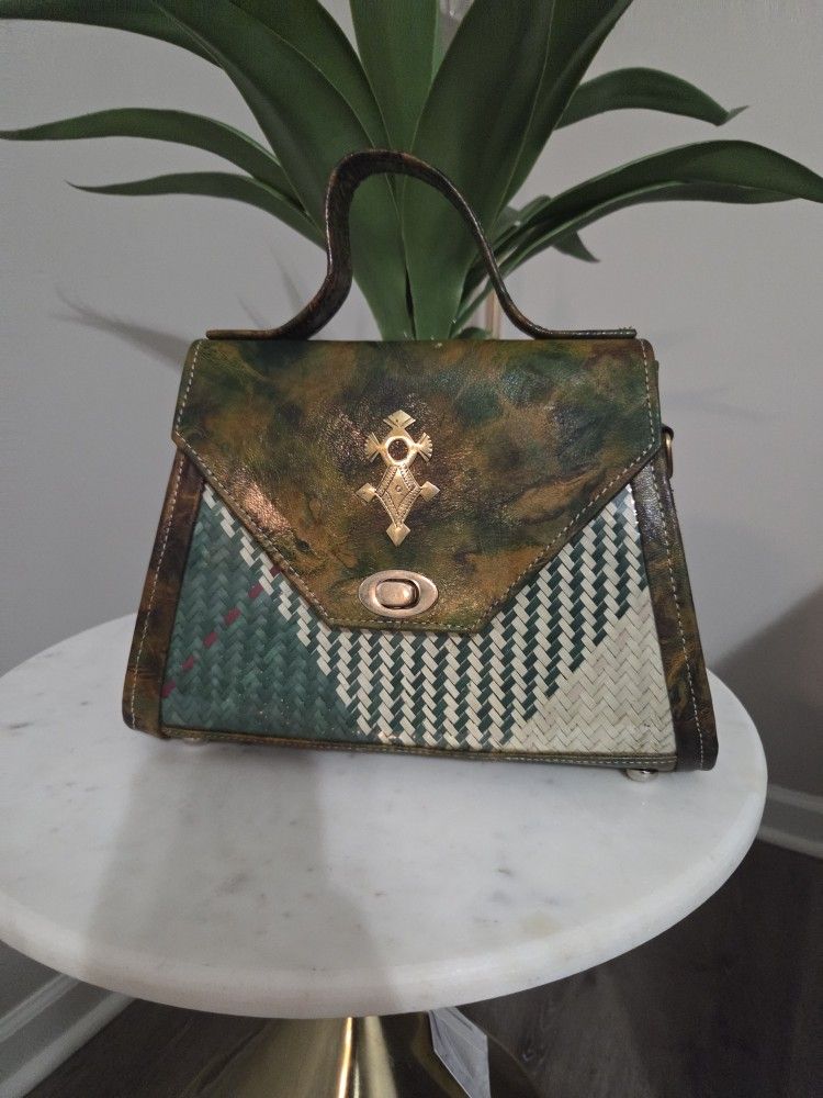 Unique vintage handbag with a stunning green marbled finish and woven-style front panel. This statement purse features a structured shape, a top handle, and a beautiful metal clasp detail—perfect for dressing up any outfit, day or night.