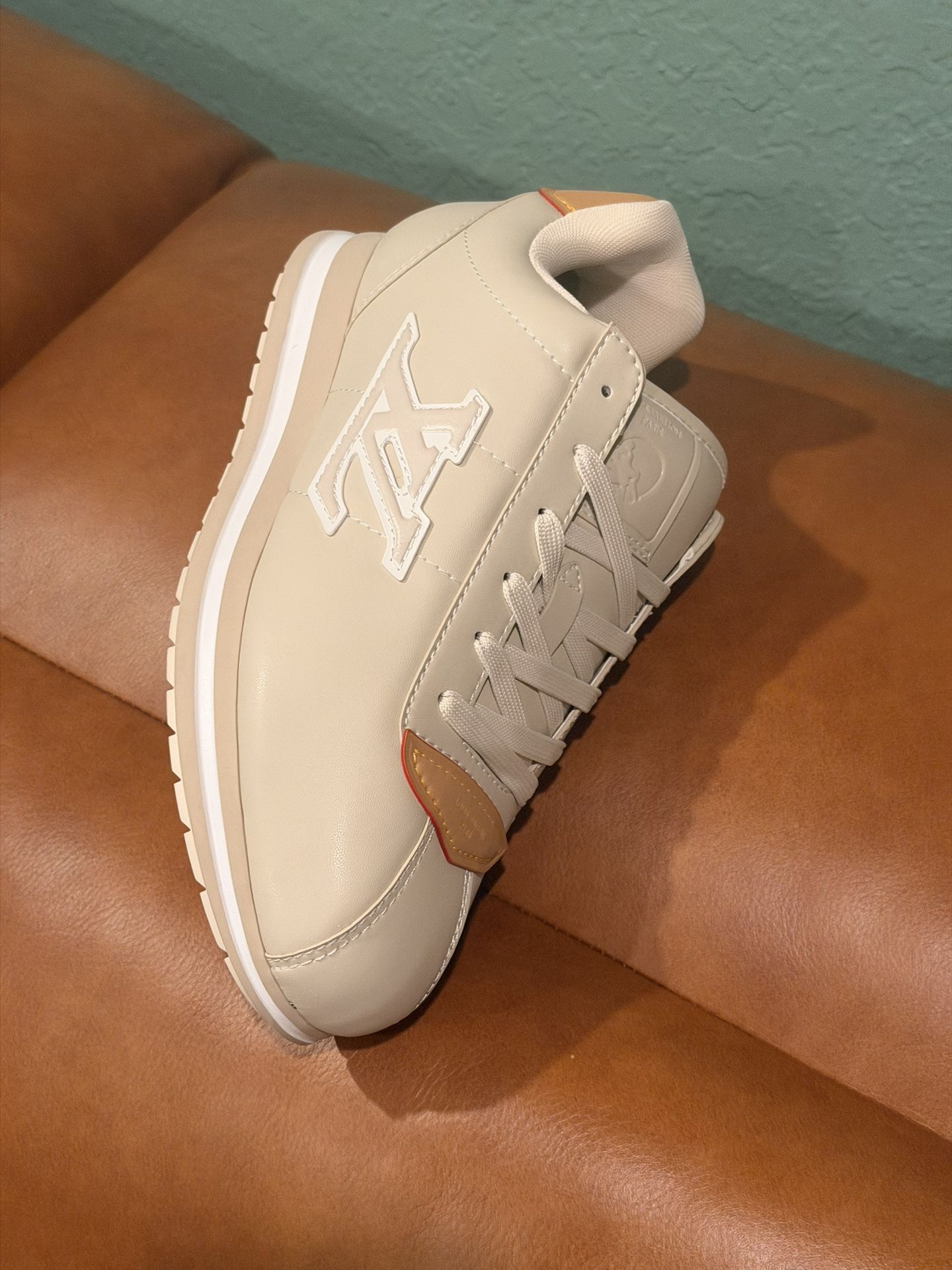 This is a Louis Vuitton Buttersoft sneaker designed by Pharrell Williams, crafted from ultra-soft lamb and calfskin leathers. It features LV Initials on the side and a padded upper for comfort. The design has a vintage look inspired by 1960s sportswear aesthetics. The sneaker is crafted in Italy, highlighting the brand's expertise. It was introduced as part of the Men's Fall-Winter 2025 collection.