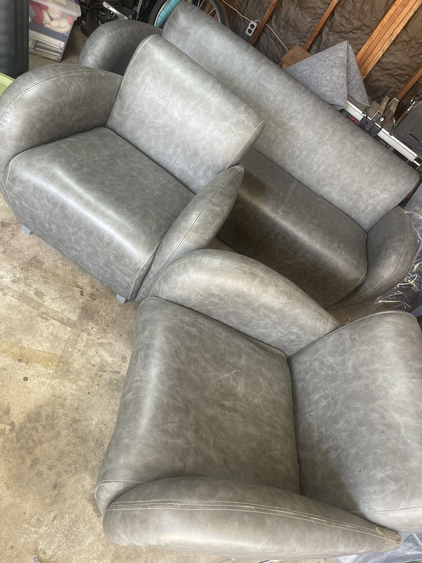 Lleather gray sofa and two chairs, great for garage or small space, durable material. Some of the trim on the chairs is coming off otherwise pretty durable.