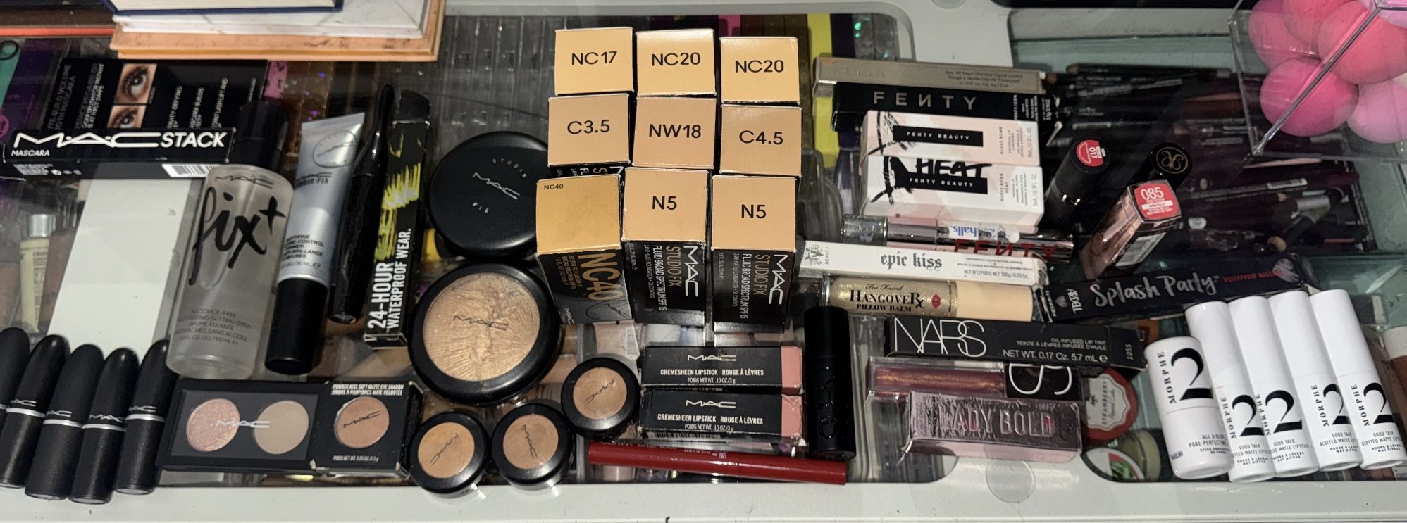 Here’s makeup I have ladies : foundations are $25 each‼️‼️‼️ Shades of the too faced foundations are: 2xTiramisu,2xmocha,2x sable,2x maple, 2x caramel, 2x hazelnut, chestnut, 2x cocoa, 2x butter pecan, 3x spiced rum, truffle,2x ganache,2x chai,honey, chestnut & snow. I also have seven Fenty, beauty setting powders $20 each ‼️ shades are : 1 coffee,2x nutmeg,2x deep dark, 1 dark and 1 cashew Mac foundations are $30 each‼️ I have two Kylie powder foundations shades 5N & 8C $25 each ‼️ Message me for prices items that’s not listed with price . Thanks