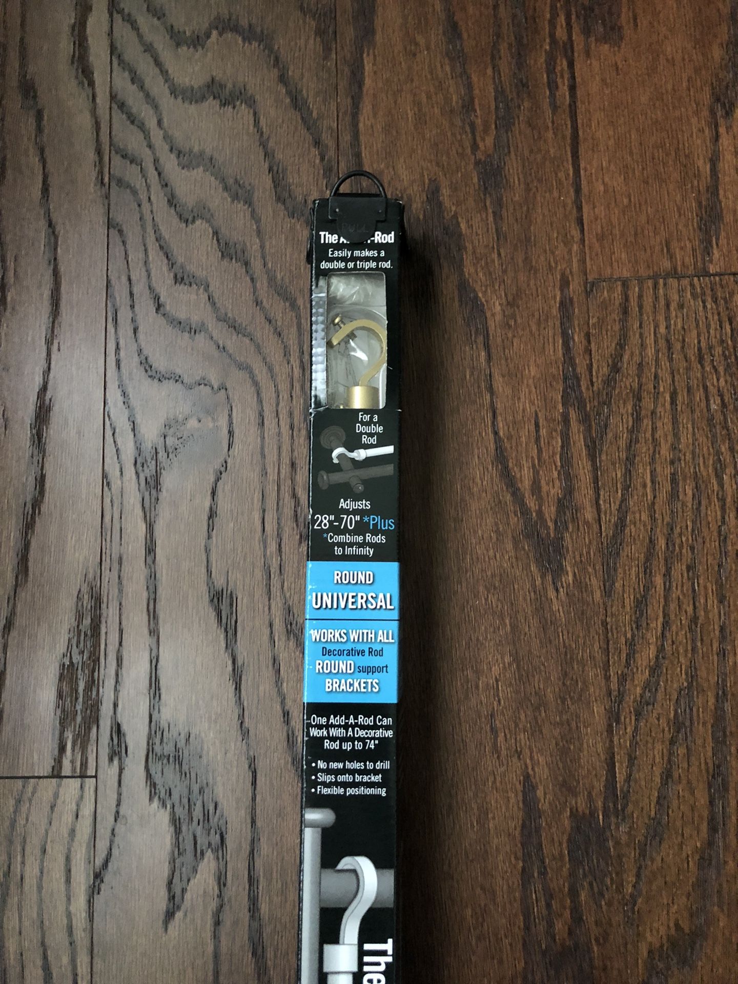 *If your curtain rod bracket is flat, I also have this item with square adapters. See my other items* Brushed Gold universal Add-A-Rod with ROUND adapters for a ROUND curtain bracket. If you have a normal decorative curtain rod with single round brackets, and you want to add a layer of sheer curtains behind the regular curtains, this hooks onto the already installed brackets so you don’t need to buy new hardware and change it out. You only need a screw driver to attach this to the current curtain rod. It stretches from 28”—70”. Hardware and installation instructions included in the box. I have TWO of these, which I used with a long (130”) main rod with a center support bracket. I redecorated and switched out the entire setup. $5 per add-a-rod, get one or both. Pickup in Long Grove.