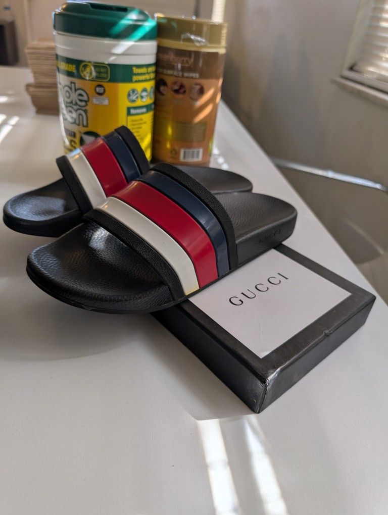 For sale are Gucci Slides Blue, White, Red And Black Slides Size listed size 44 in Euro which is size 11 in US. But they really fit like a size 10. Maybe even size 9.5 They are Brand New and Flawless