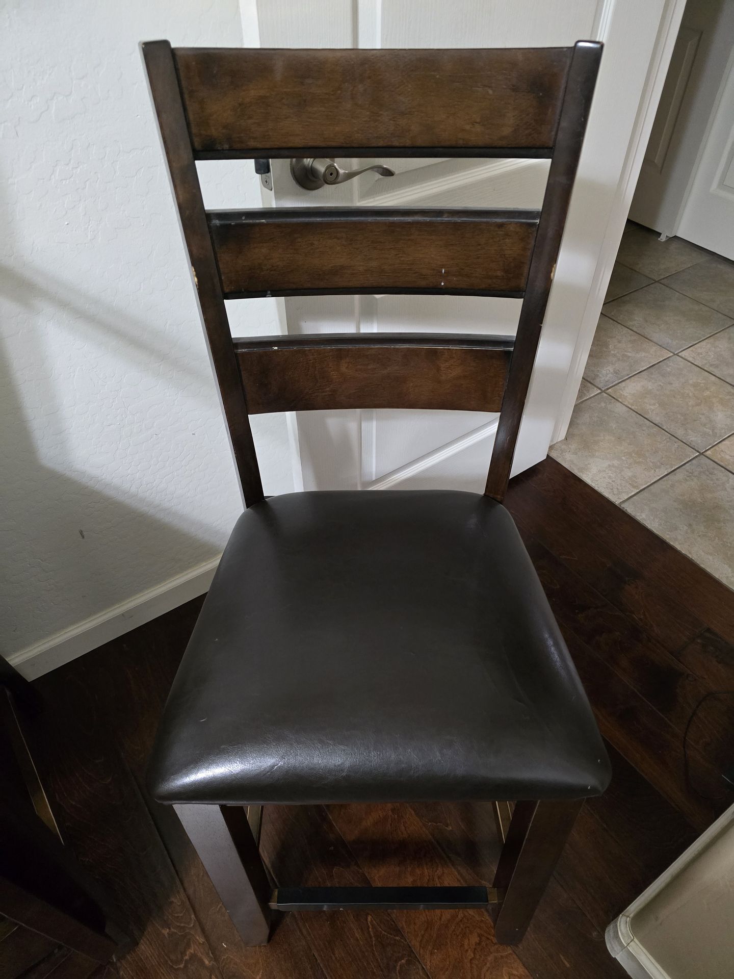 From American Furniture Warehouse, in good overall condition. They're made from wood with faux leather cushions. Half of them have some cracking in the leather cushion (see pictures), the others are all in good shape. Selling as set of 10. They are counter height (i.e., taller than standard table chairs). Cost $175 each new, asking $50 each ($500 for all). Buyer must pick up, closest cross streets are Williams Field and Gilbert. Also selling matching counter height kitchen table, please see other ad if interested.