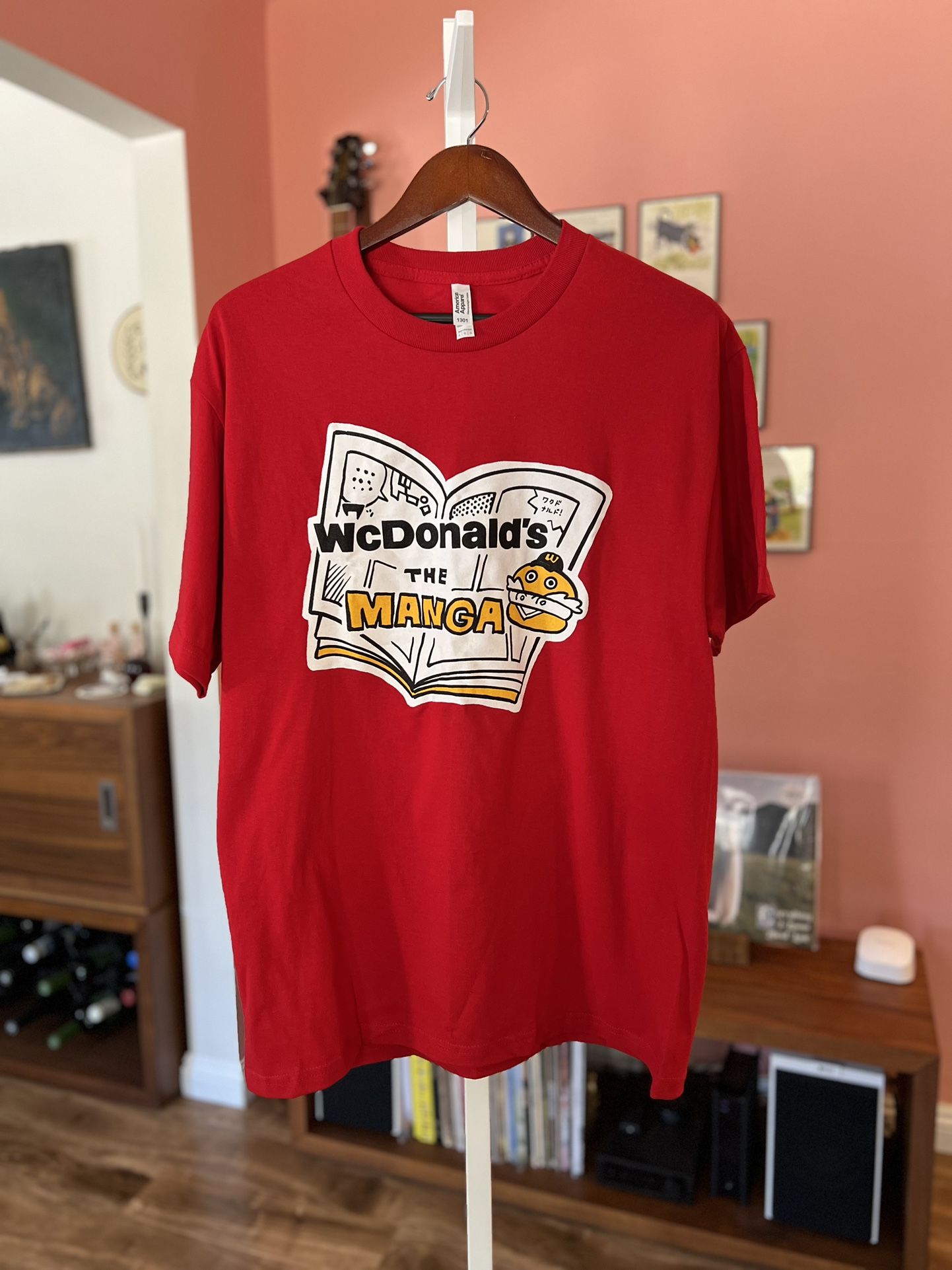 $50 each or two for $75. Both are American Apparel size Large. Rare tees from an event promoting the limited time WcDonald’s McDonald’s anime manga promotion. Gifts from an exclusive private event.