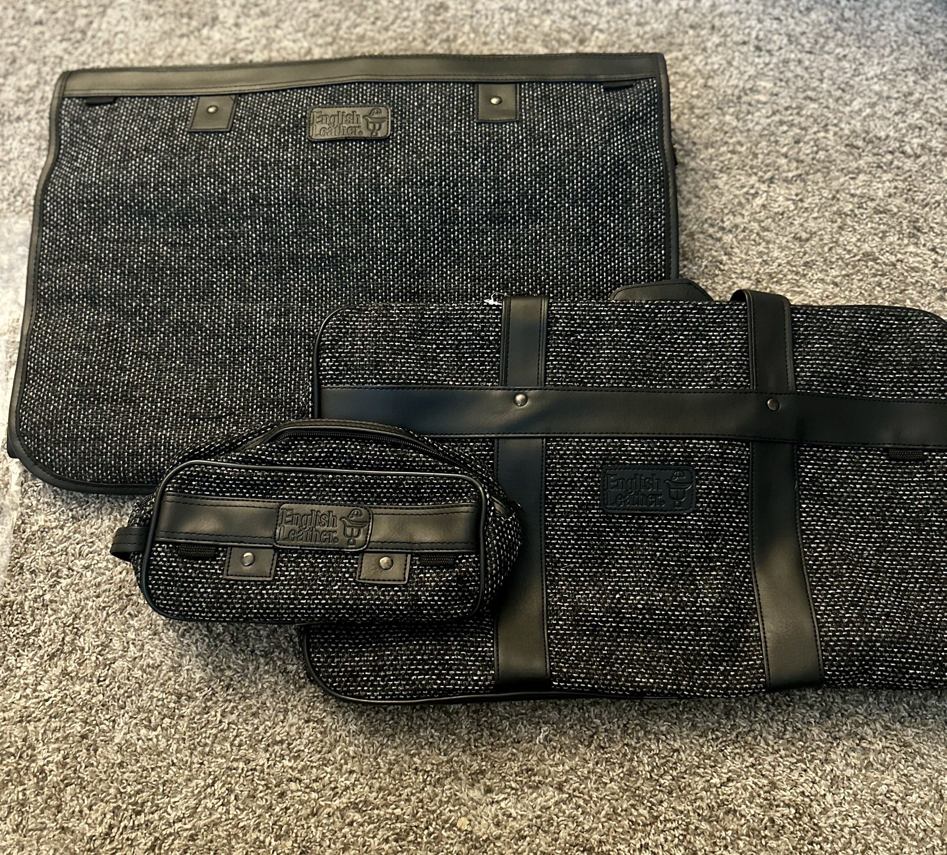 New never used Vintage English Leather "The Tweed Collection" 3 Piece Luggage set. Rare to find