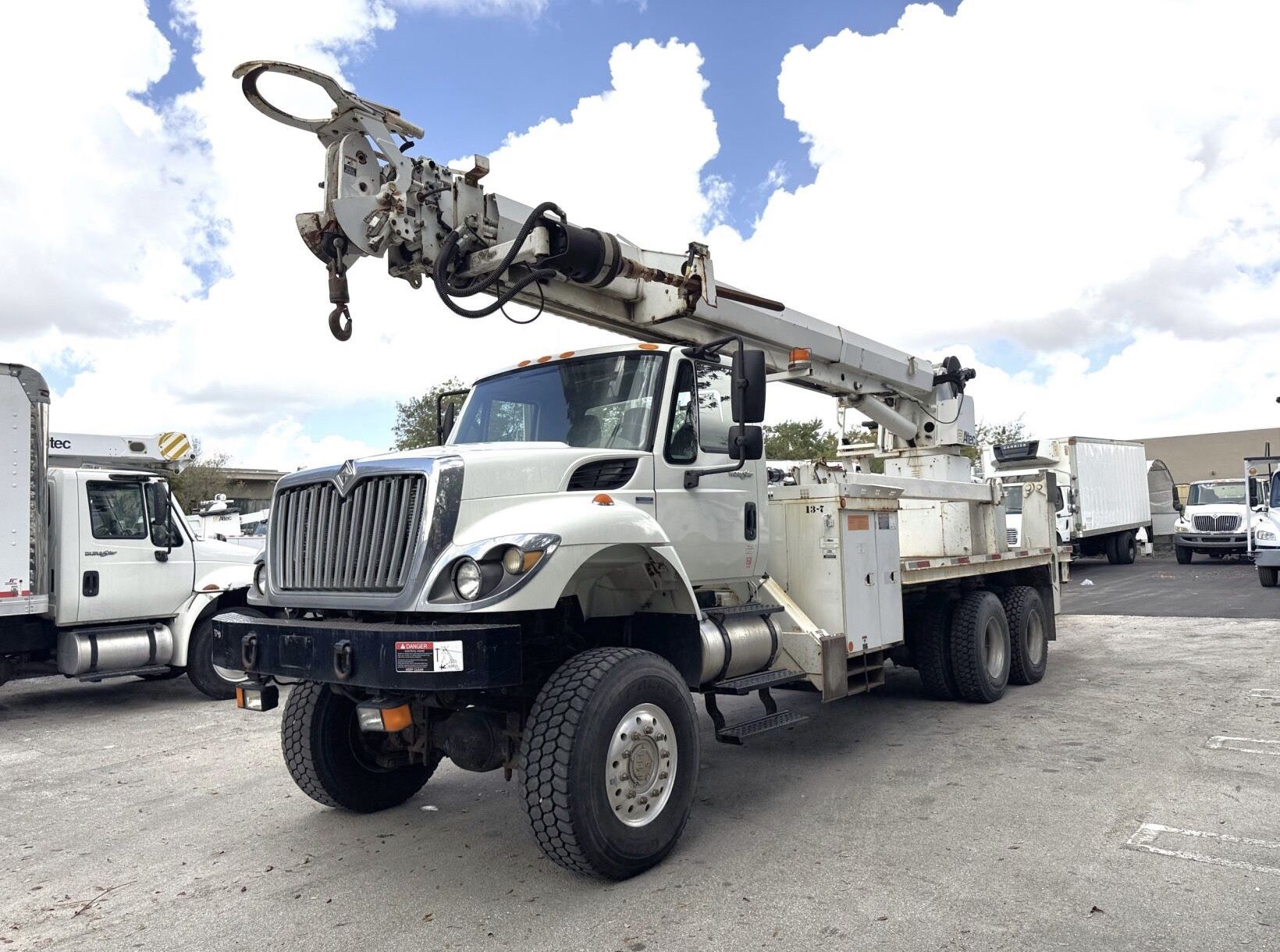 305495 DIGGER TRUCK INTERNATIONAL 7400 SBA 6X4 2009 10 SPEED ALTEC D4065A T (2 SPEED). SALE: $ 49,500.00 MAKER: INTERNATIONAL. MODEL: 7400 SBA 6X4. VIN: 1HTWGAAT39J087150. YEAR: 2009. COLOR: WHITE. A/C: YES. ENGINE: MAXXIFORCE. TRANSMISSION: 10 SPEED EATON FULLER. MILEAGE: +47K MILES. TIRE: GOOD USE 90% FRONT BOMPER WINCH: NO. FRONT: 20,000 LBS. REAR: 40,000 (2) LBS. GVWR: 60K LBS. DIGGER: ALTEC D4065A T. MODEL: D4065A T. SERIAL: 0808DF0261. TOP CRANE UTILTY WHINCH: 29,310 LBS. 15 FT. MATERIAL HANDLING JIB. STANDARD: 5.8' FEET 29,310 LBS 80°. EXTENDED: 50 FEET 1,360 LBS 14°. UTILITY EQUIPMENT DIGGER DERRICK BOOM AUGER POLE. DOUBLE SPEED USED DIGGER TRUCK INTERNATIONAL 7400 SBA 6X4 2009 10 SPEED ALTEC D4065A T (2 SPEED).