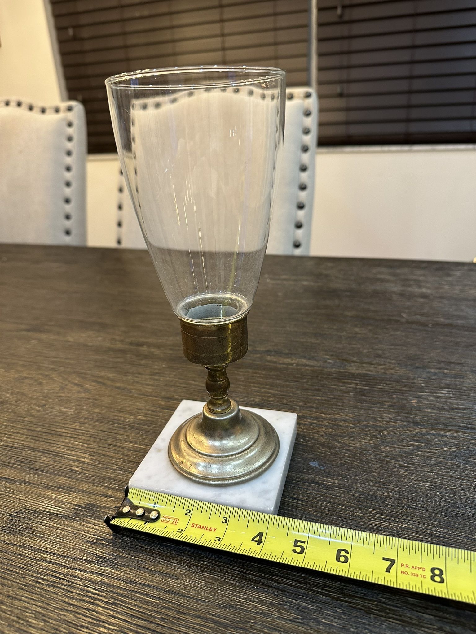Beautiful vintage hurricane candle holder with a clear glass shade, brass stem, and solid white marble base. A classic piece that adds timeless charm to your home decor - perfect for mantel, dining room, bedroom, or entryway. The glass shade gently tapers and catches light beautifully. The brass has a warm patina that enhances its vintage character. Condition: Good vintage condition with light wear consistent with age. Glass is free from major chips or cracks (minor surface haze/scratches typical). Brass shows natural patina — can be polished for a brighter shine if desirea.! Marble base is sturdy and clean with no breaks