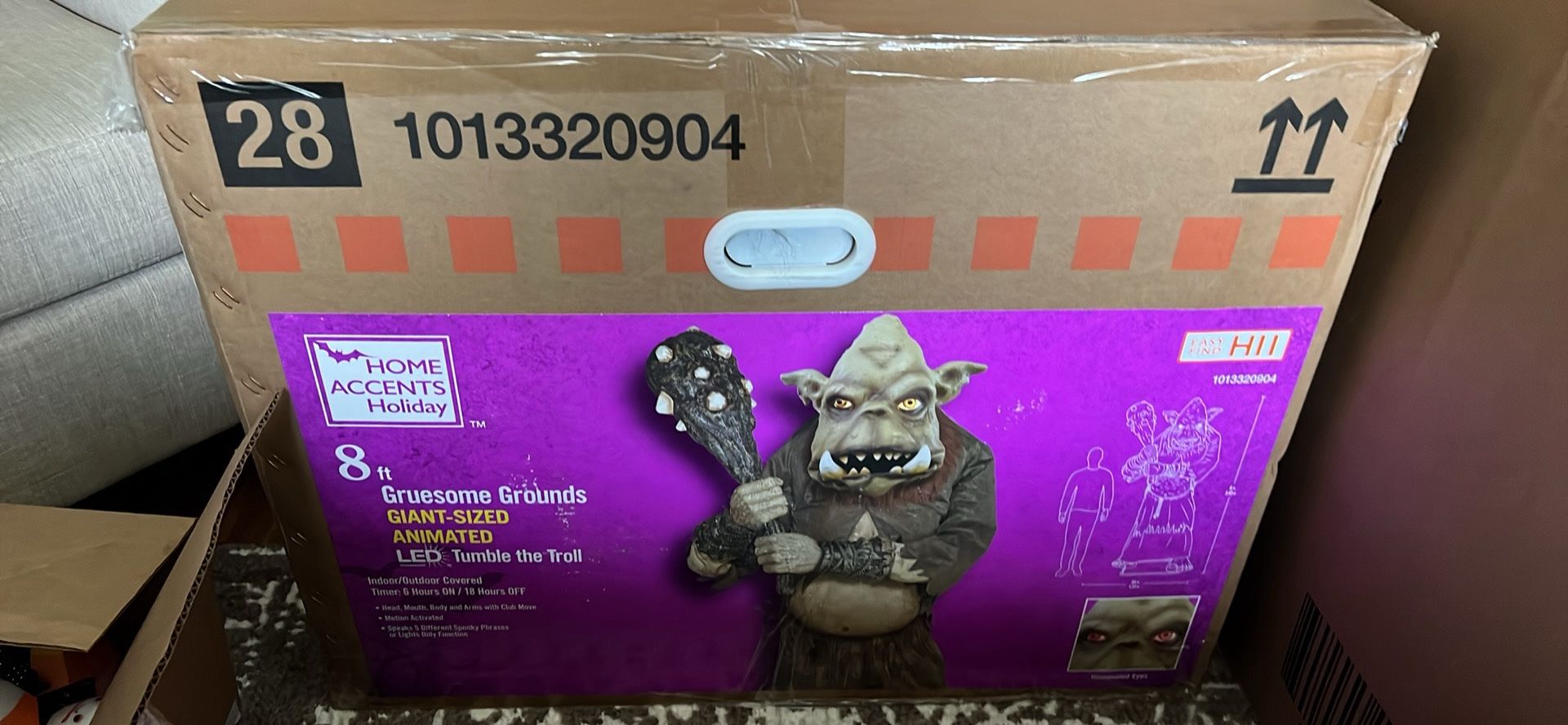 New in box cash only no holds pickup orchard and mill ( oswego) 8 Ft Giant-Sized Animated Tumble the Troll Halloween Animatronic Prop is a creepy and fun addition to your Halloween decor. This standing decor features a multicolor design and comes with 5 different phrases and 4 movements. It is equipped with a motion sensor, light, and sound to create a thrilling experience