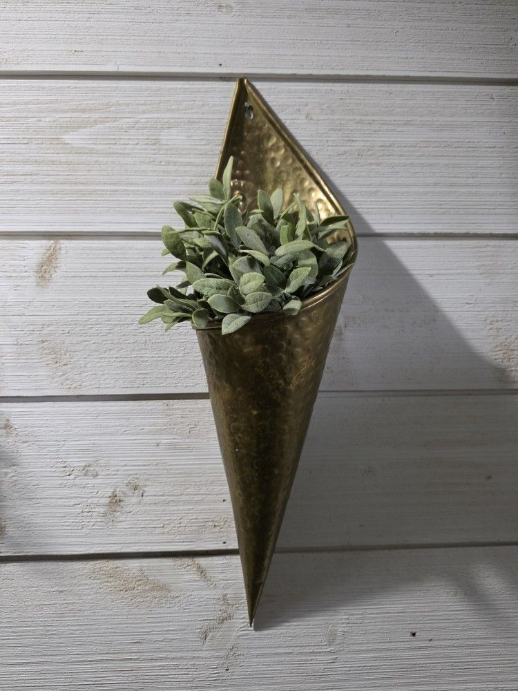 Cone-gratulations! You've found the perfect accent piece. This beautiful brass wall planter is ready to hold your botanical beauties and uplift your decor. Dimensions : 22" Tall and 6" Wide Please feel free to check out my other unique listings. ♡