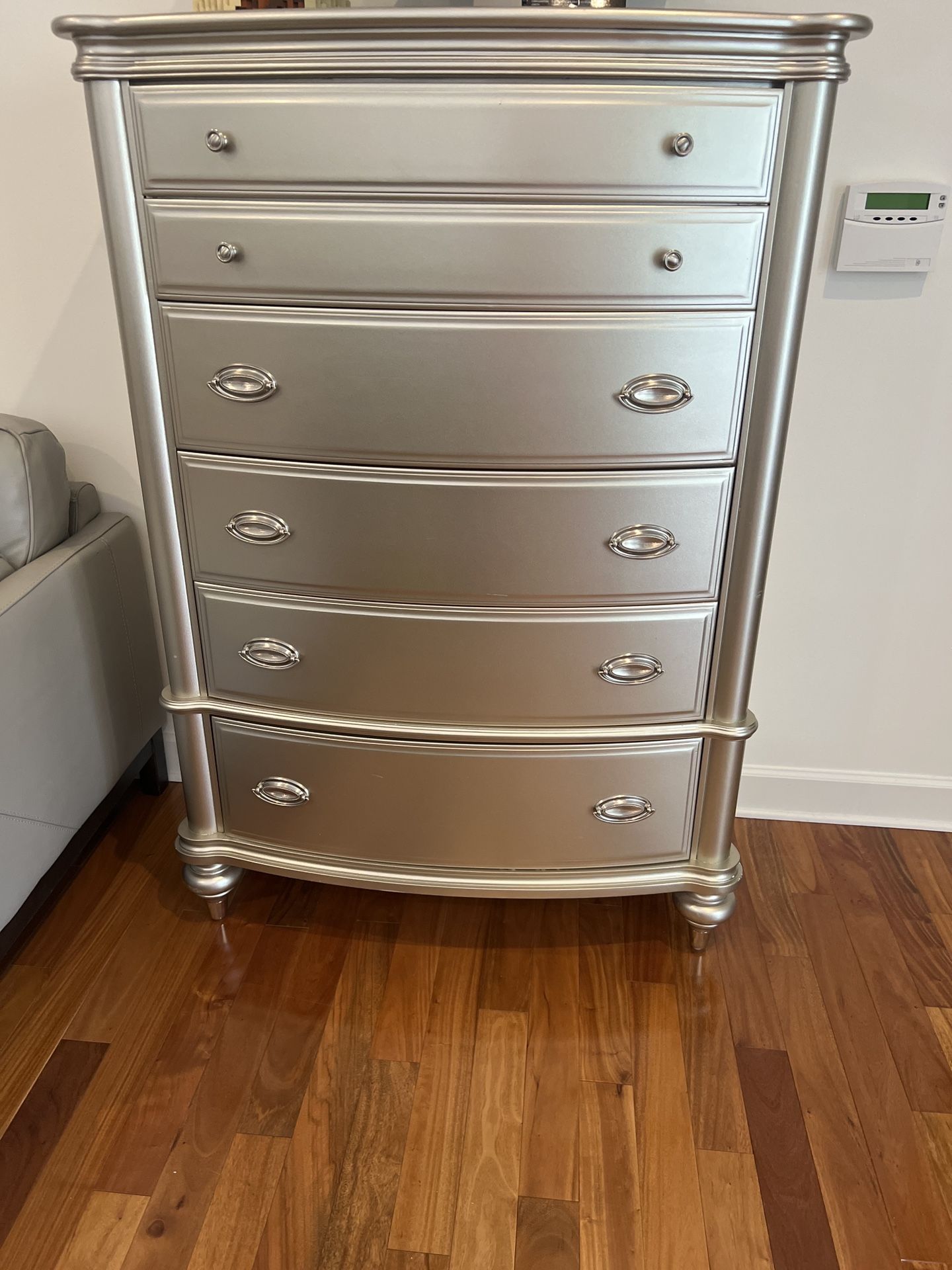 Elegant silver chest with matching dresser Original painted color with red painted drawers Gently used I would like to sell these as a set 39x17x56 62x17.5x41